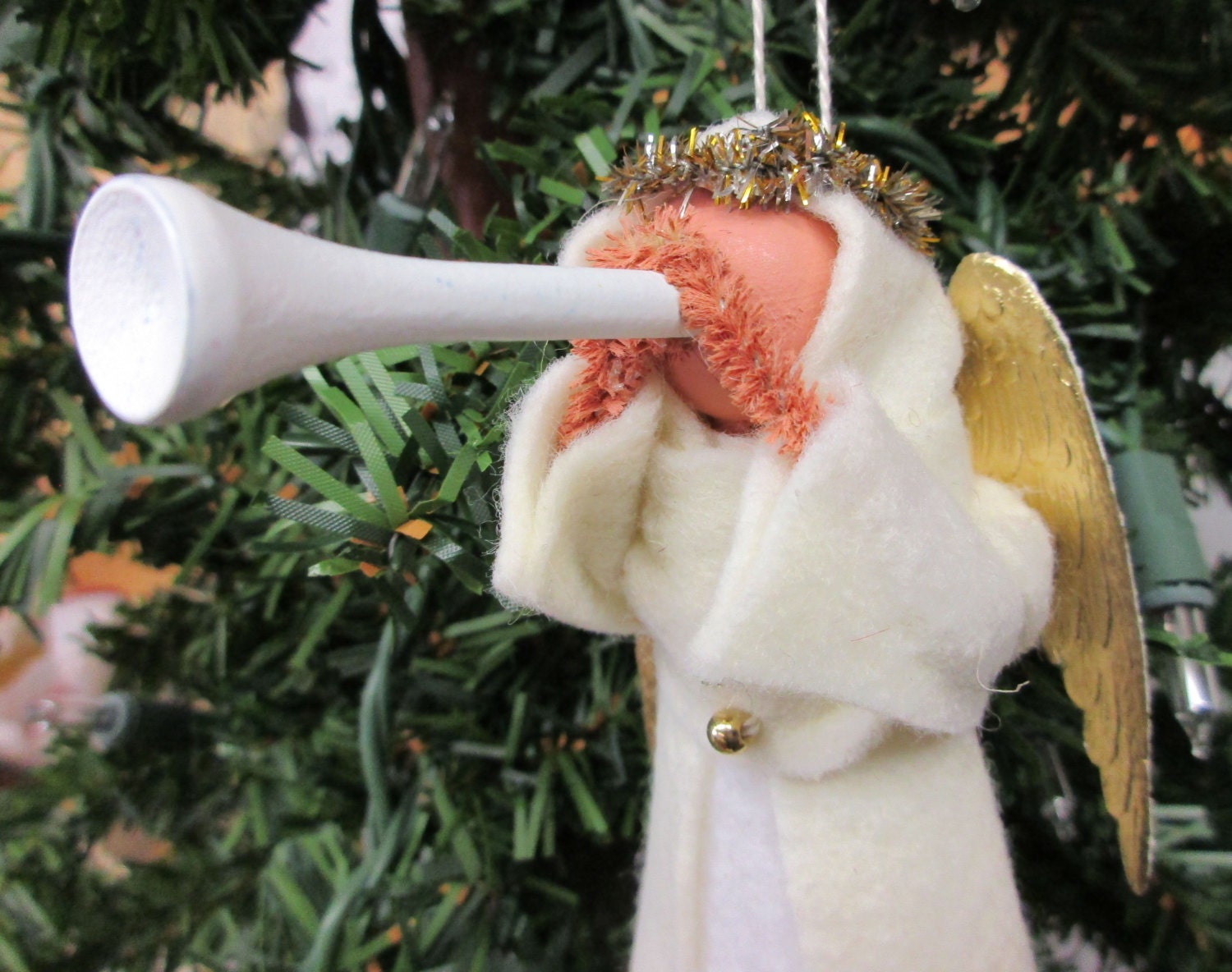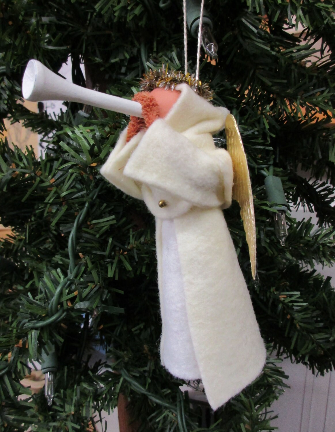 A hooded angel clothespin ornament announcing the birth of baby Jesus.