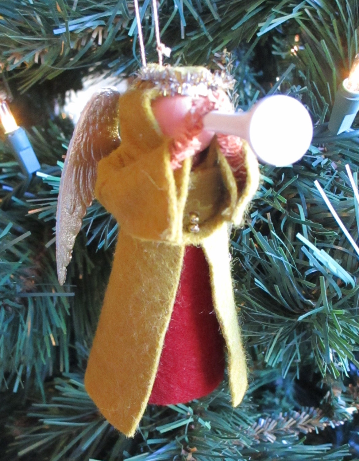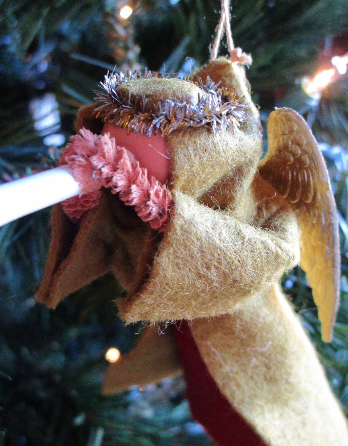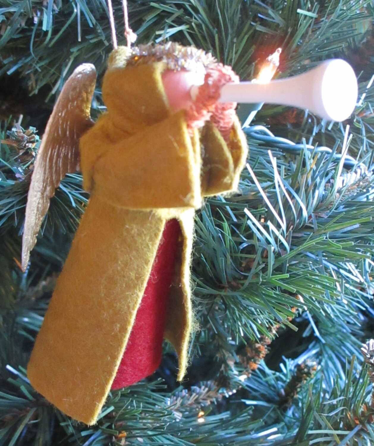Made from craft wood, clothespin, and wool felt with a pair of gold Dresden wings.