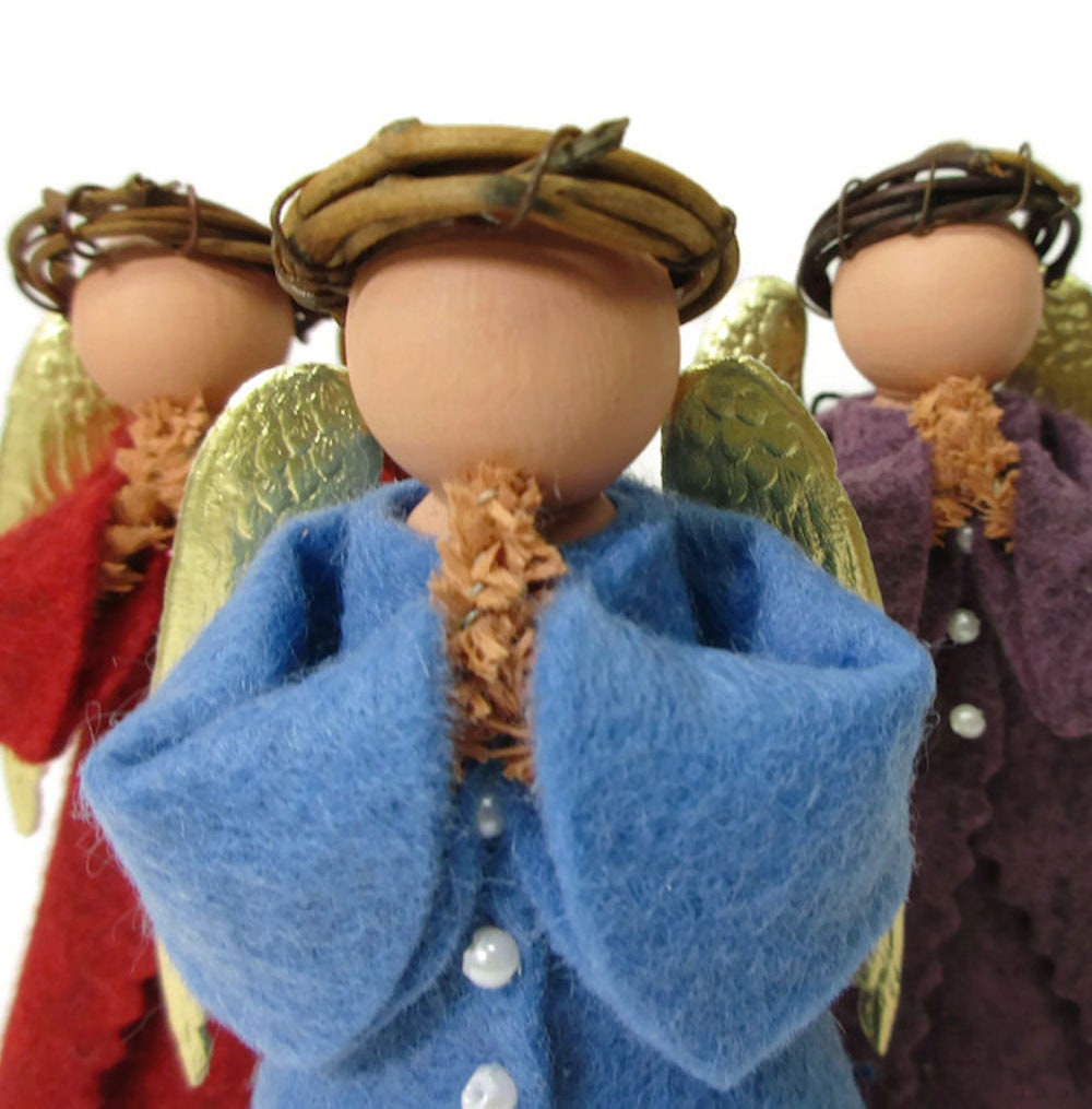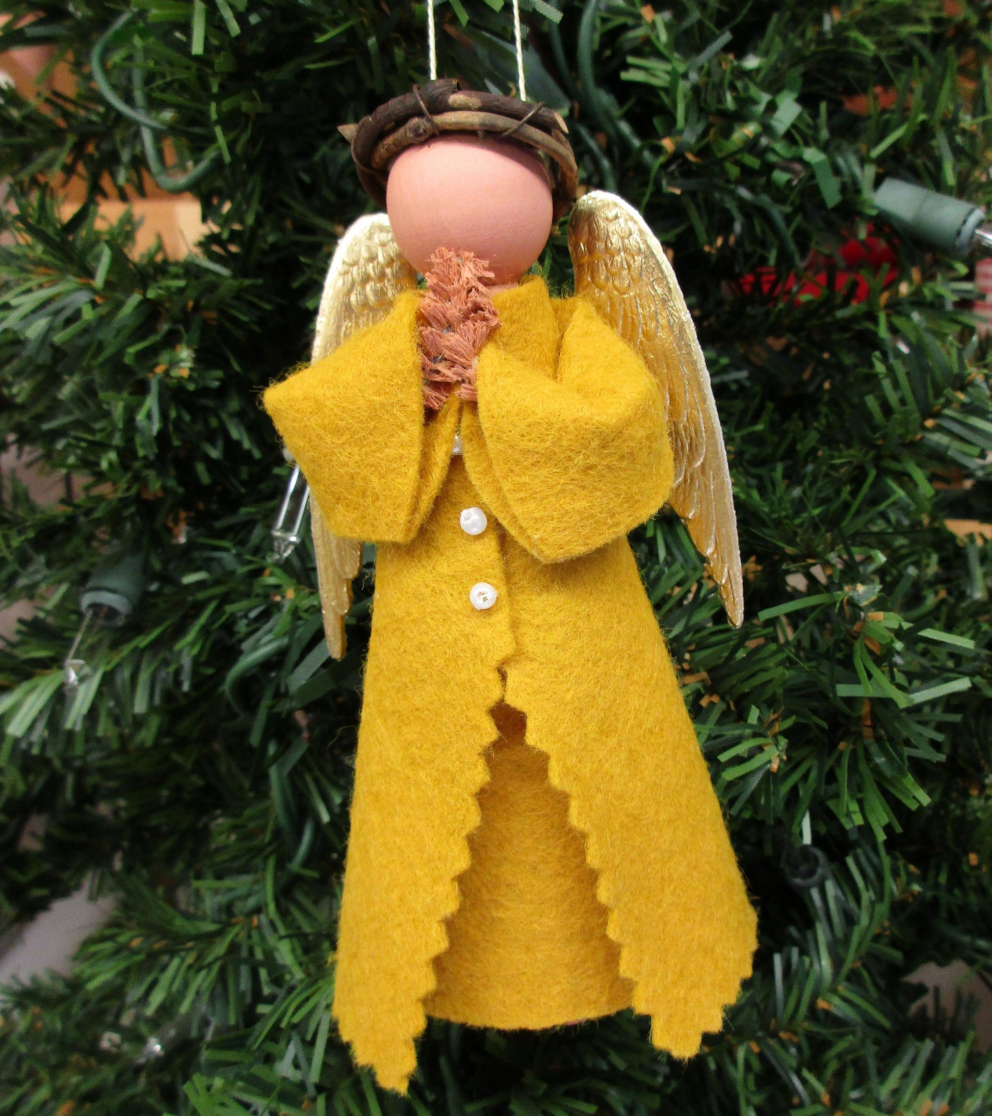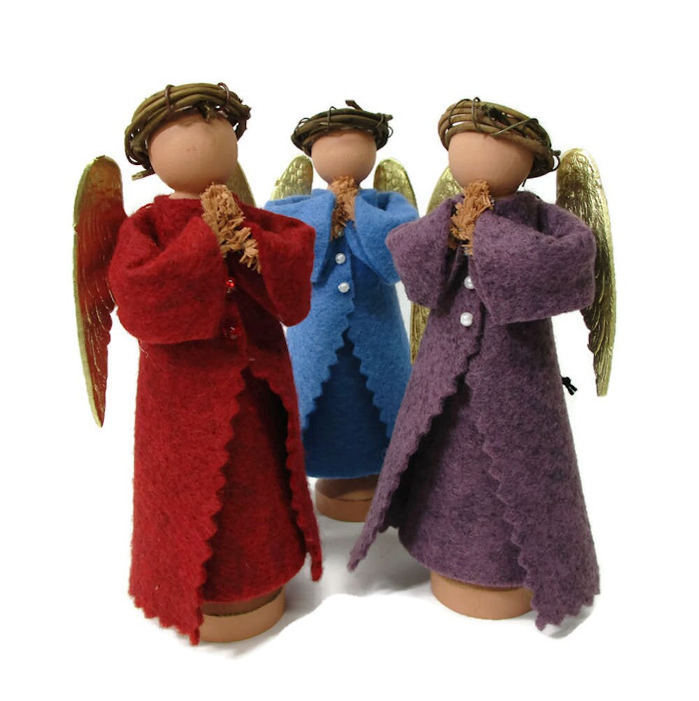Handmade from craft wood, clothespin and wool felt with a pair of gold Dresden wings. Each angel is ready-to-hang with a hanging loop and includes a doll stand for display on a table, shelf, or tiered tray.