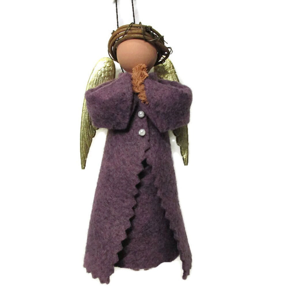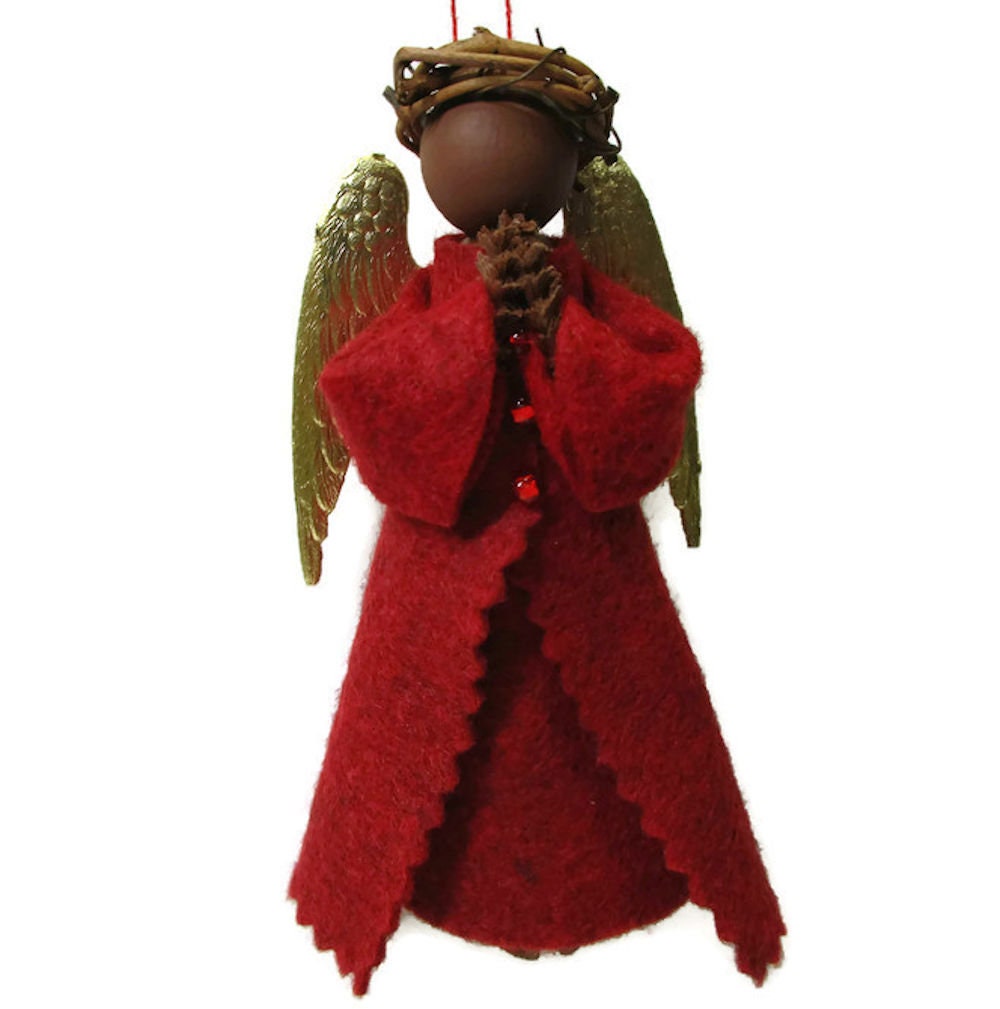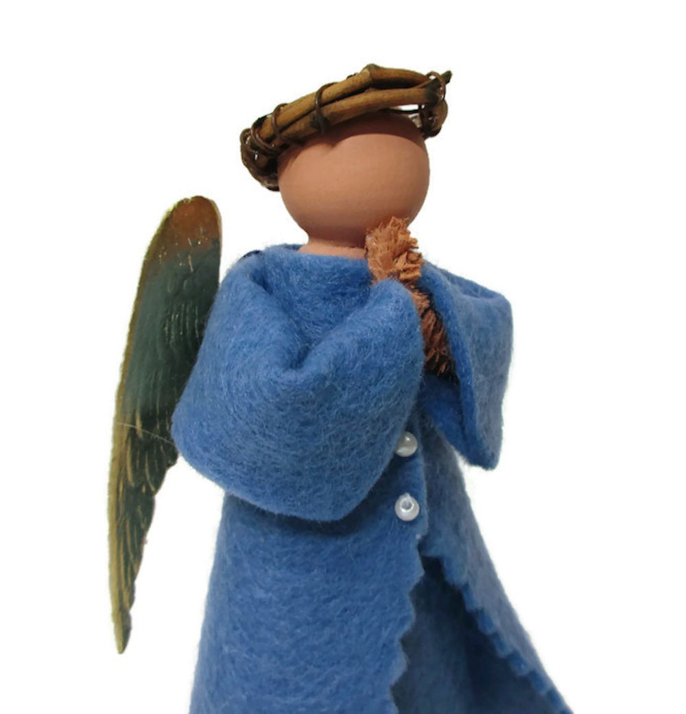 Handmade from craft wood, clothespin and wool felt with a pair of gold Dresden wings. Each angel is ready-to-hang with a hanging loop and includes a doll stand for display on a table, shelf, or tiered tray.