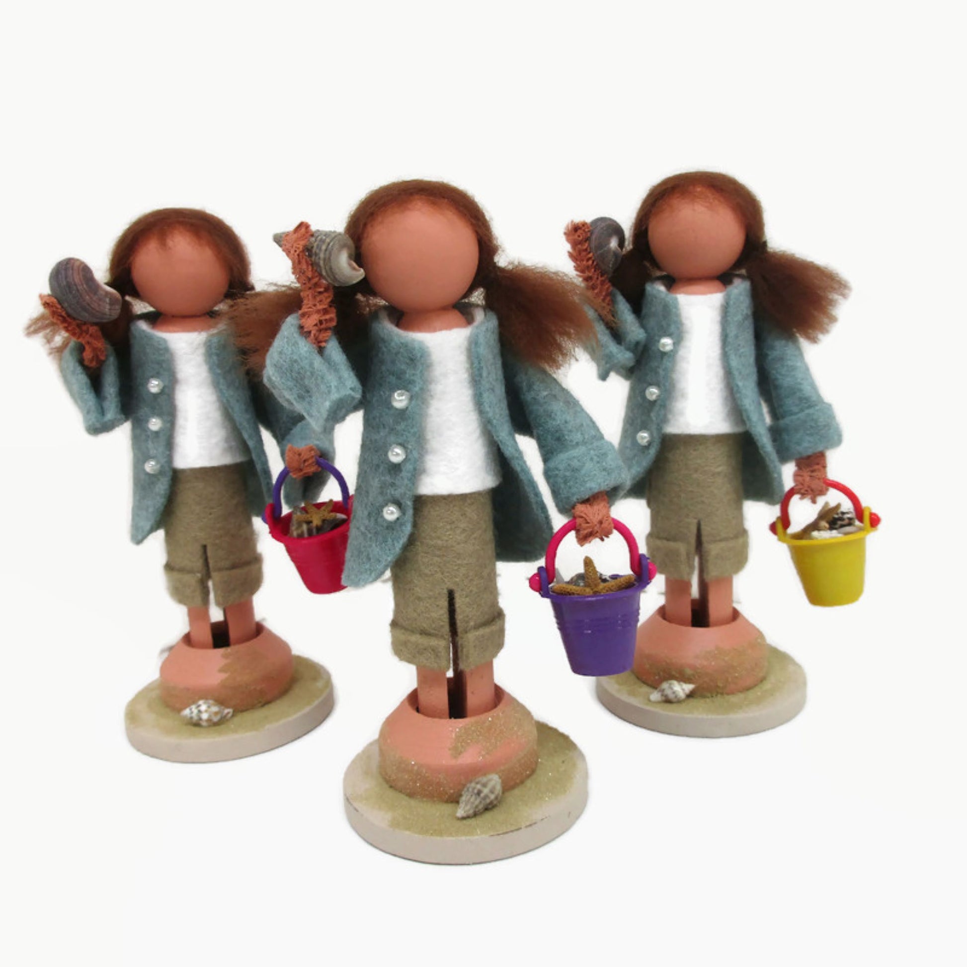 Made from craft wood, clothespin body, roving and wool felt. NOTE: Colors of beach pails are random and will vary.