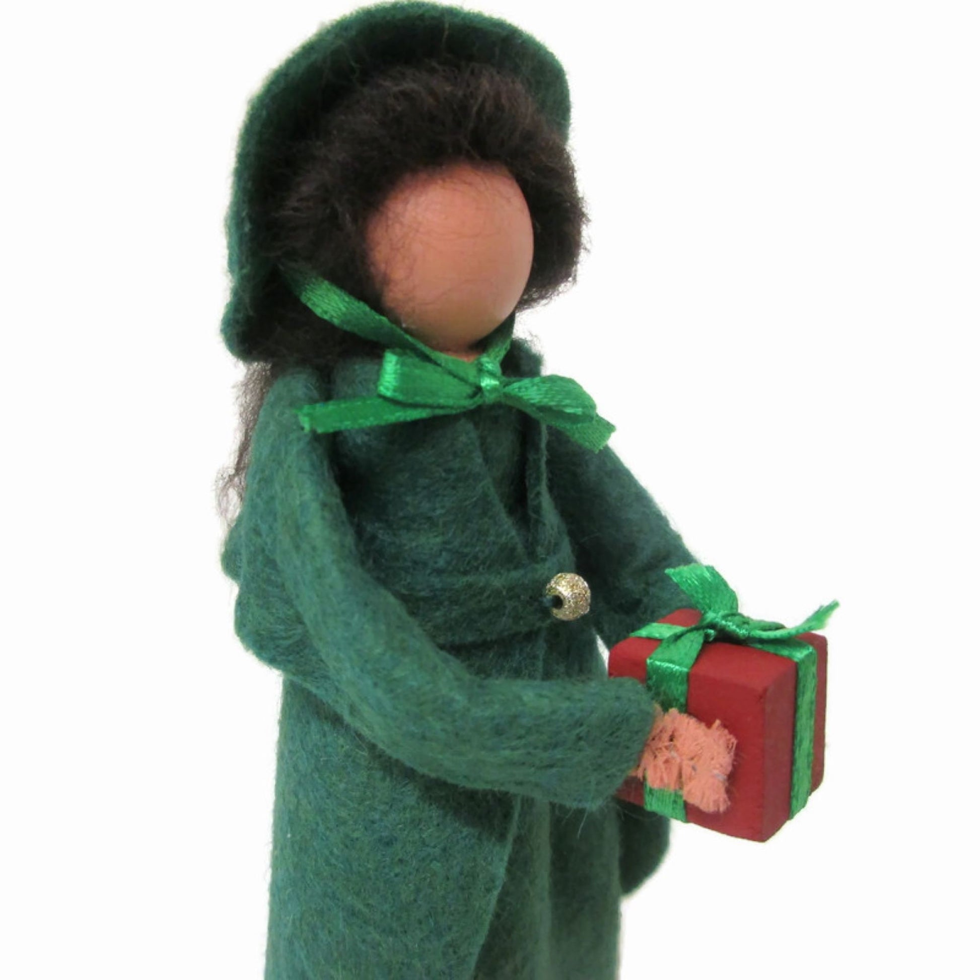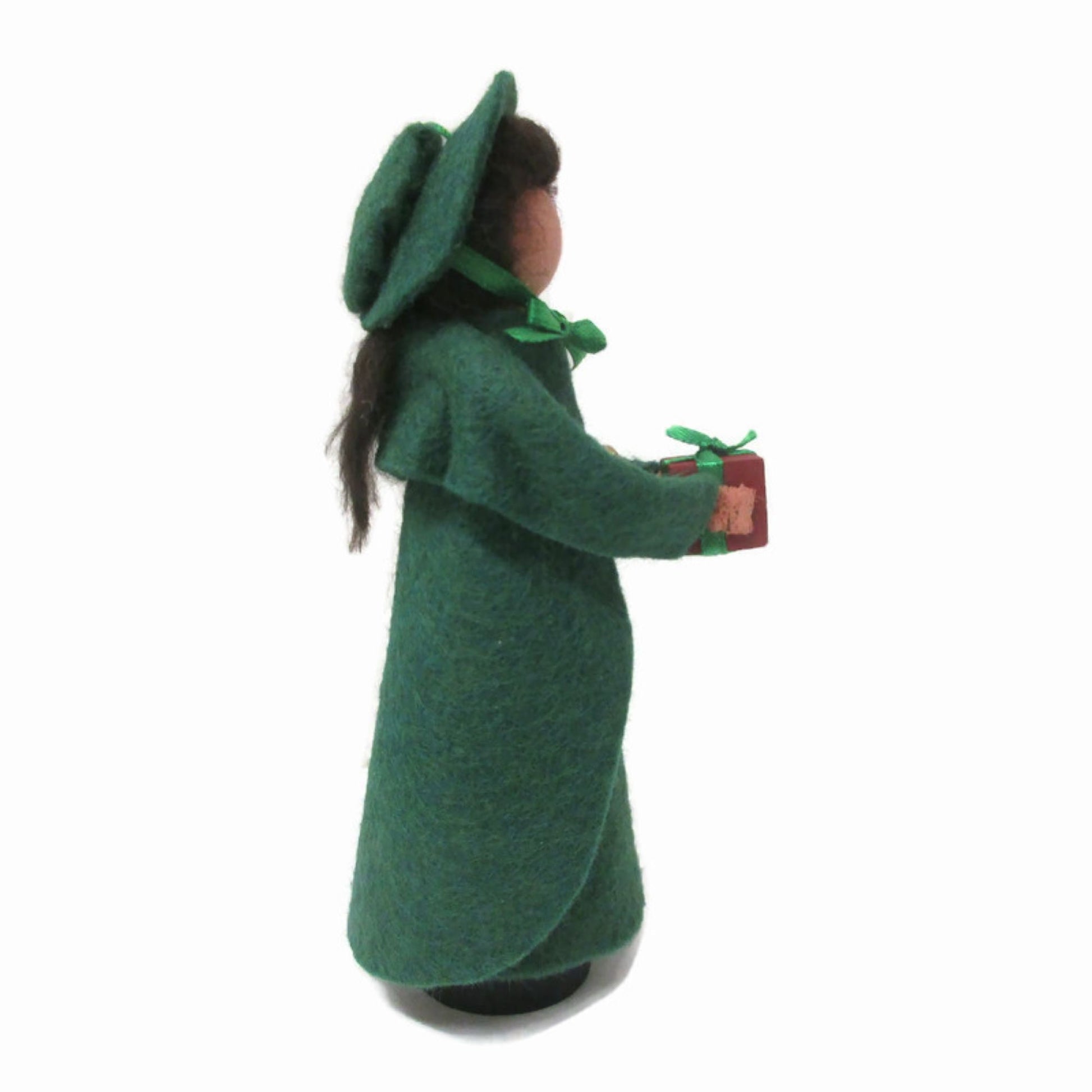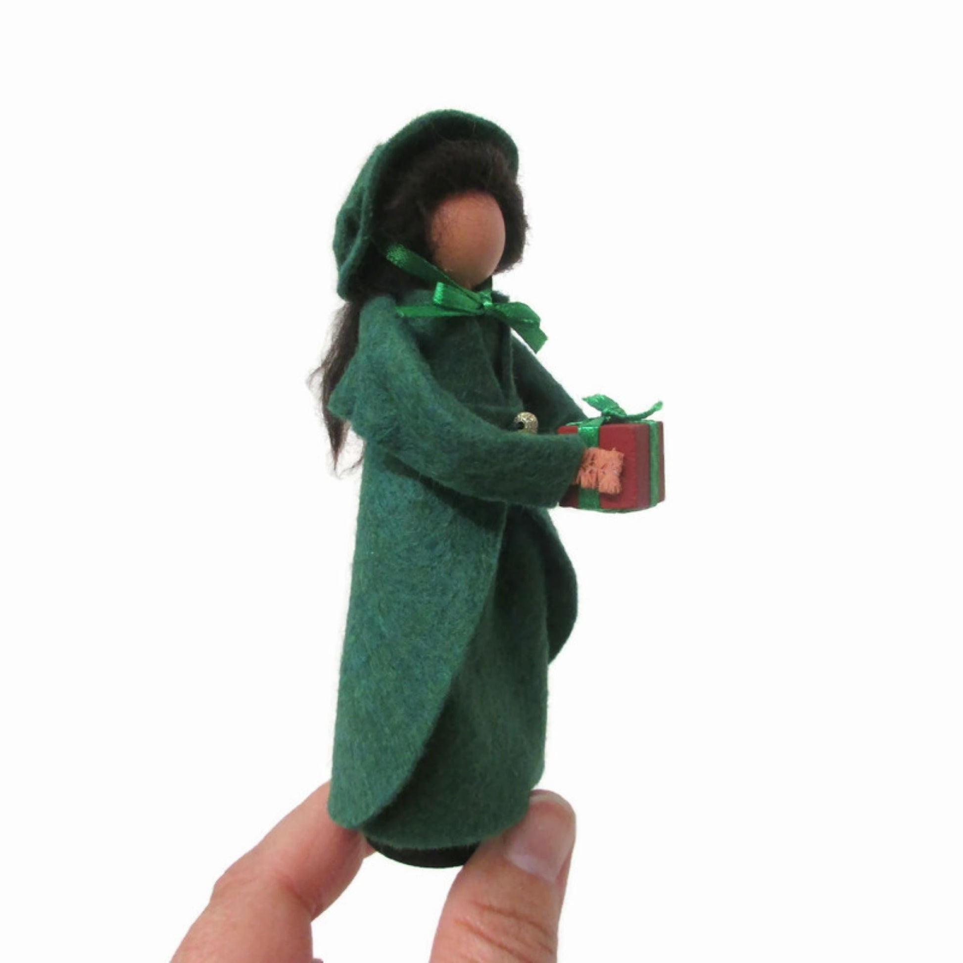 Made from craft wood, clothespin body, and wool felt. She is ready to hang on your holiday tree with a loop through the top of her hat. Or use the included doll stand to display her on any table, shelf or tiered tray.