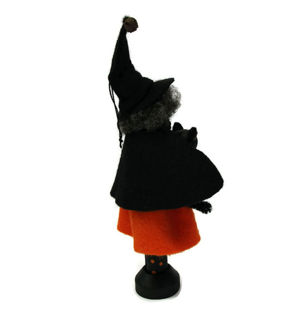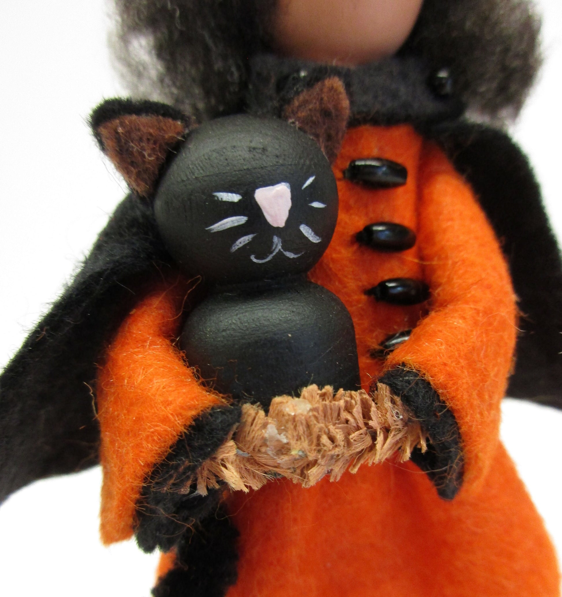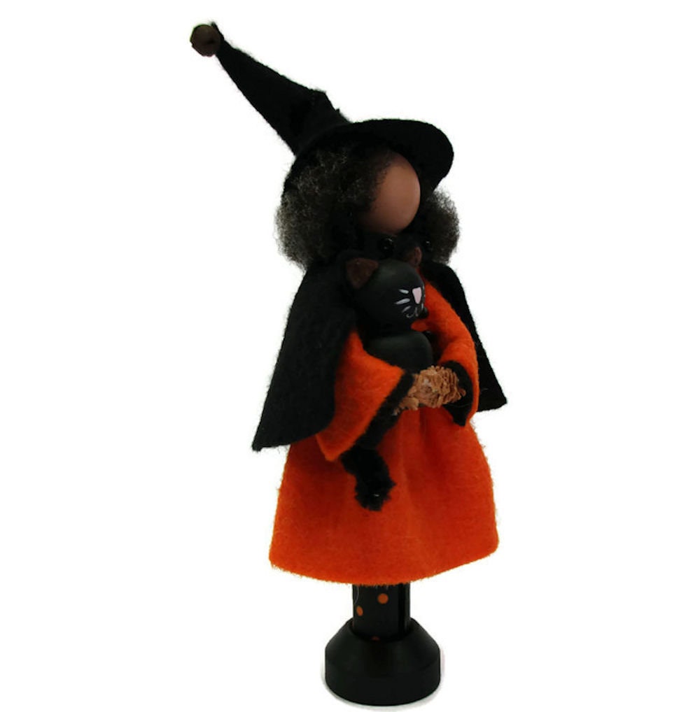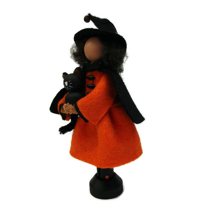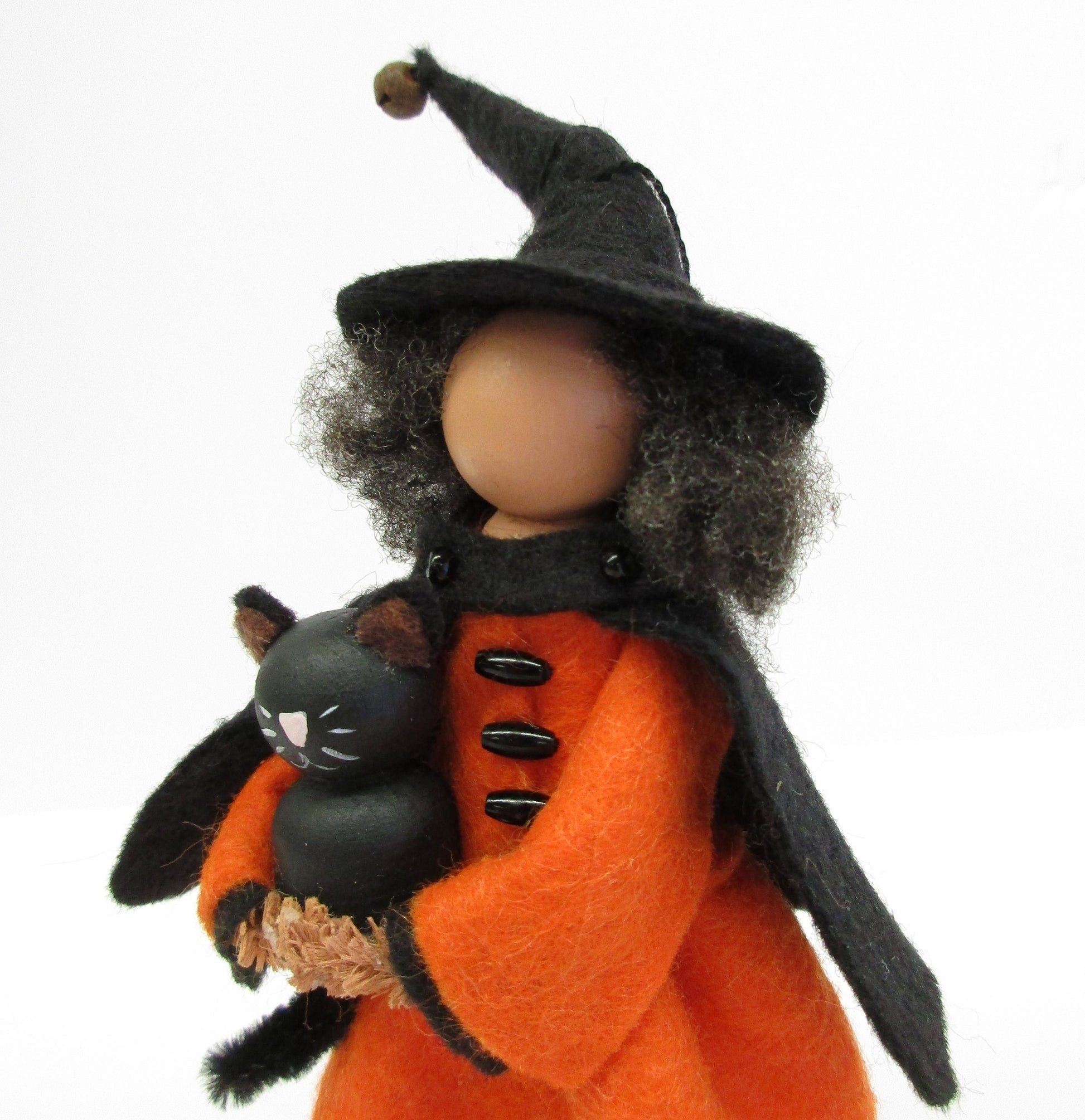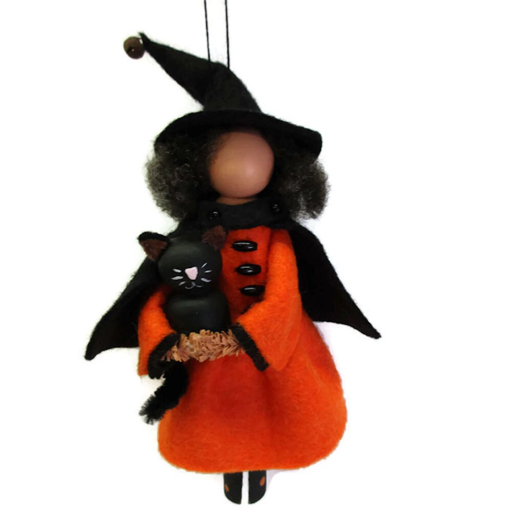 Made from craft wood, peg doll, clothespin, and wool felt. They come ready to hang on your Halloween tree, or use the included doll stand to stand them on any table, shelf, or tiered tray.