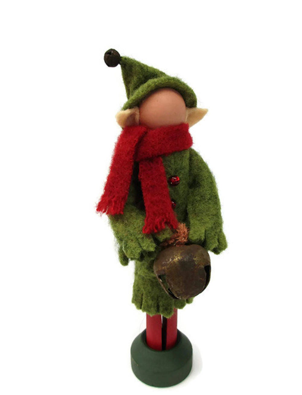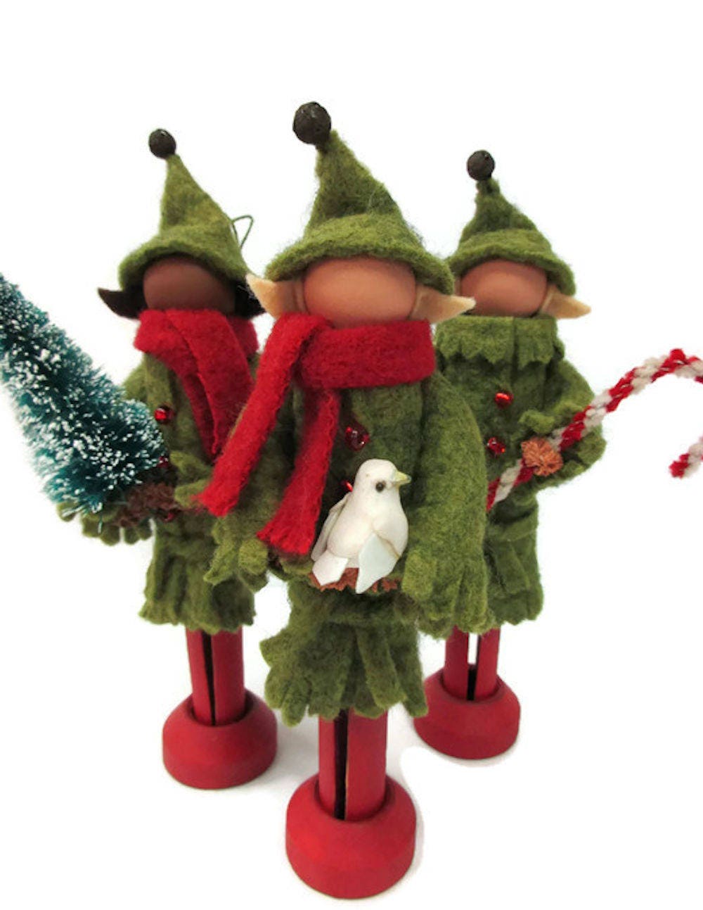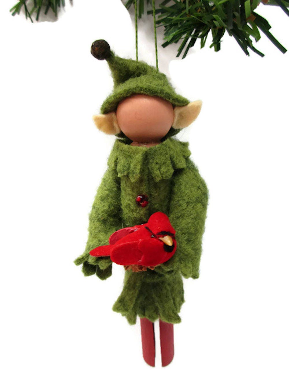 The classic elf clothespin ornament in green tunic. Lots of possible looks available with combination of collar type and attachment of your choosing.