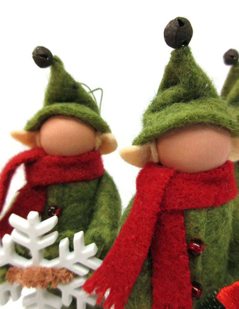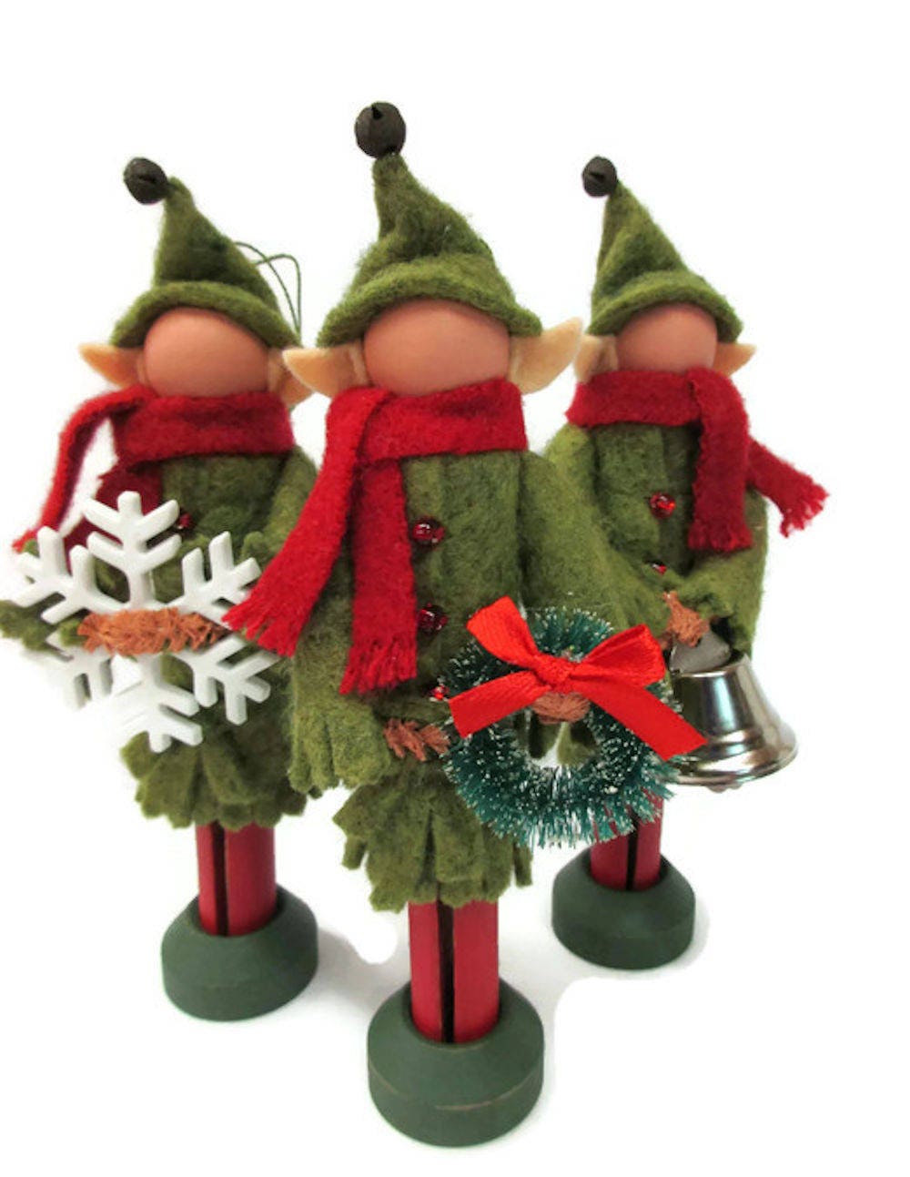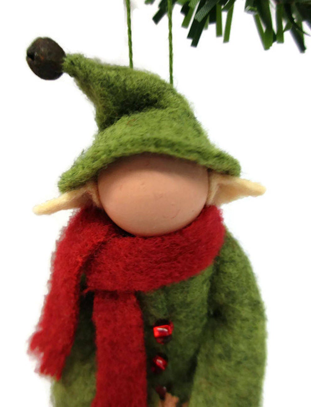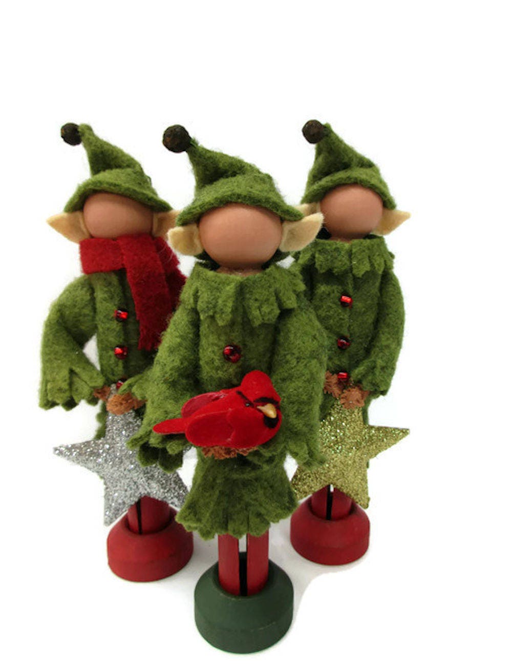 The classic elf clothespin ornament in green tunic. Lots of possible looks available with combination of collar type and attachment of your choosing.