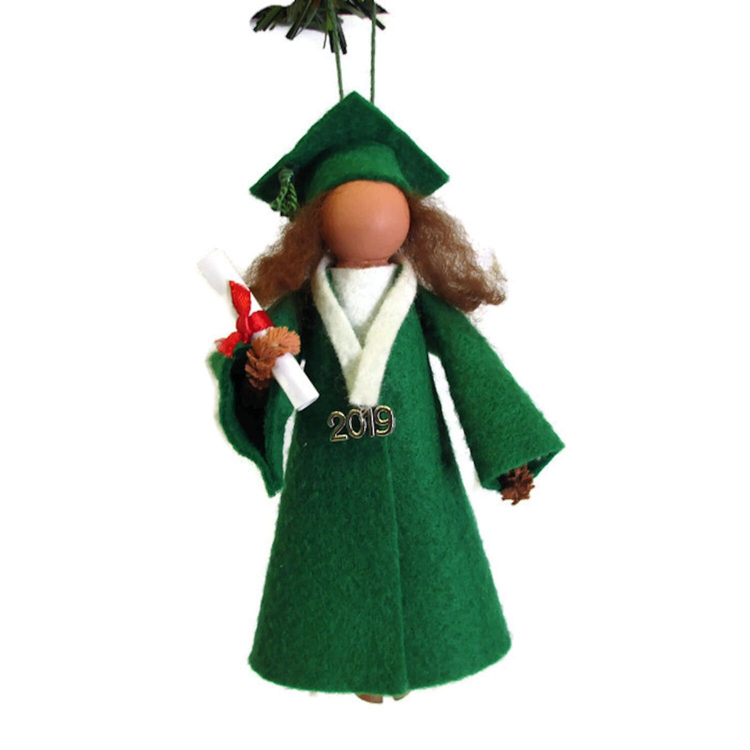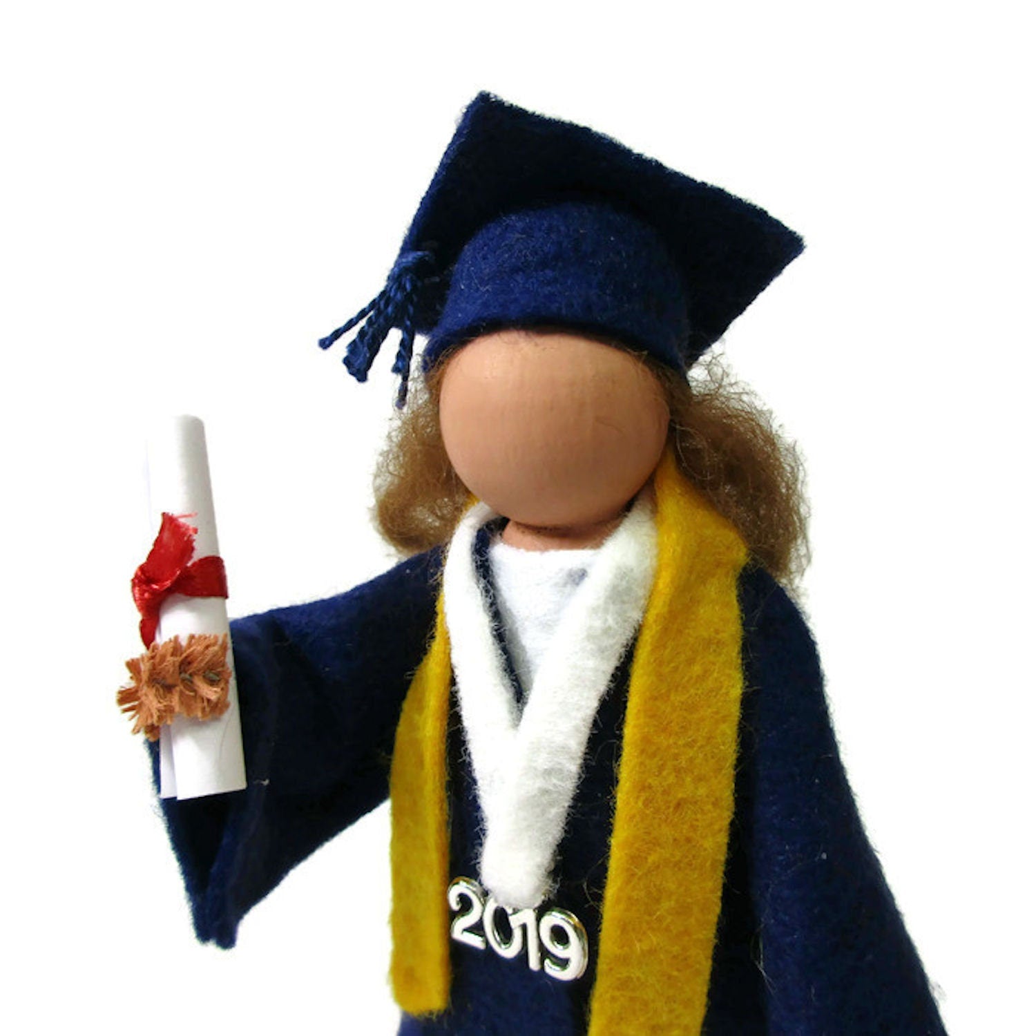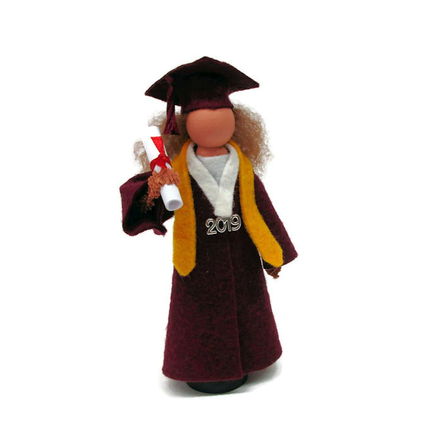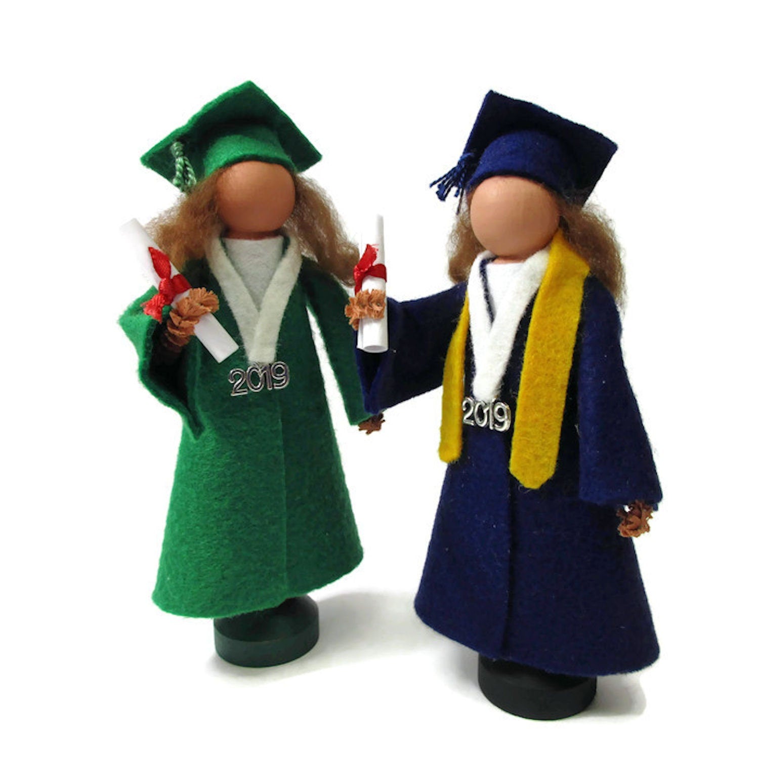 Made from craft wood, clothespin body and wool felt. Select the school color needed for the gown and let us know with additional comments on your order of any customization you would like, such as hair color, honor stole, etc.