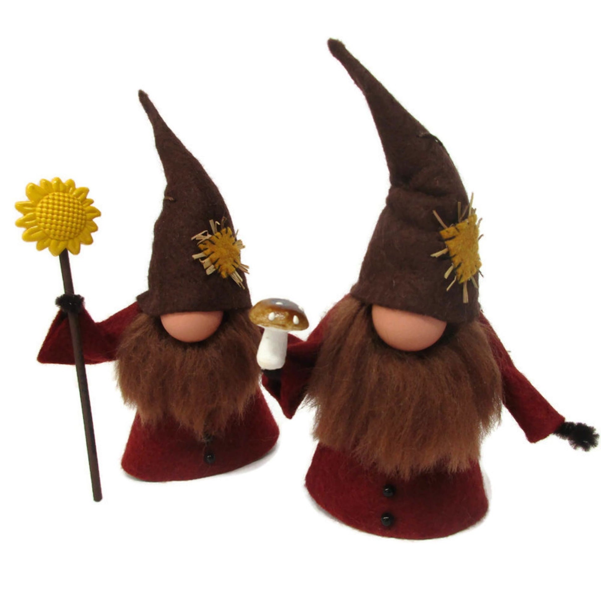 Made from a (cut) clothespin, wood ball and wool felt. Choose your preference of both coat color and the item you would like him to hold. Gnomes will have brown beards with the exception of those with brown coats - their beards will be rust/auburn color.