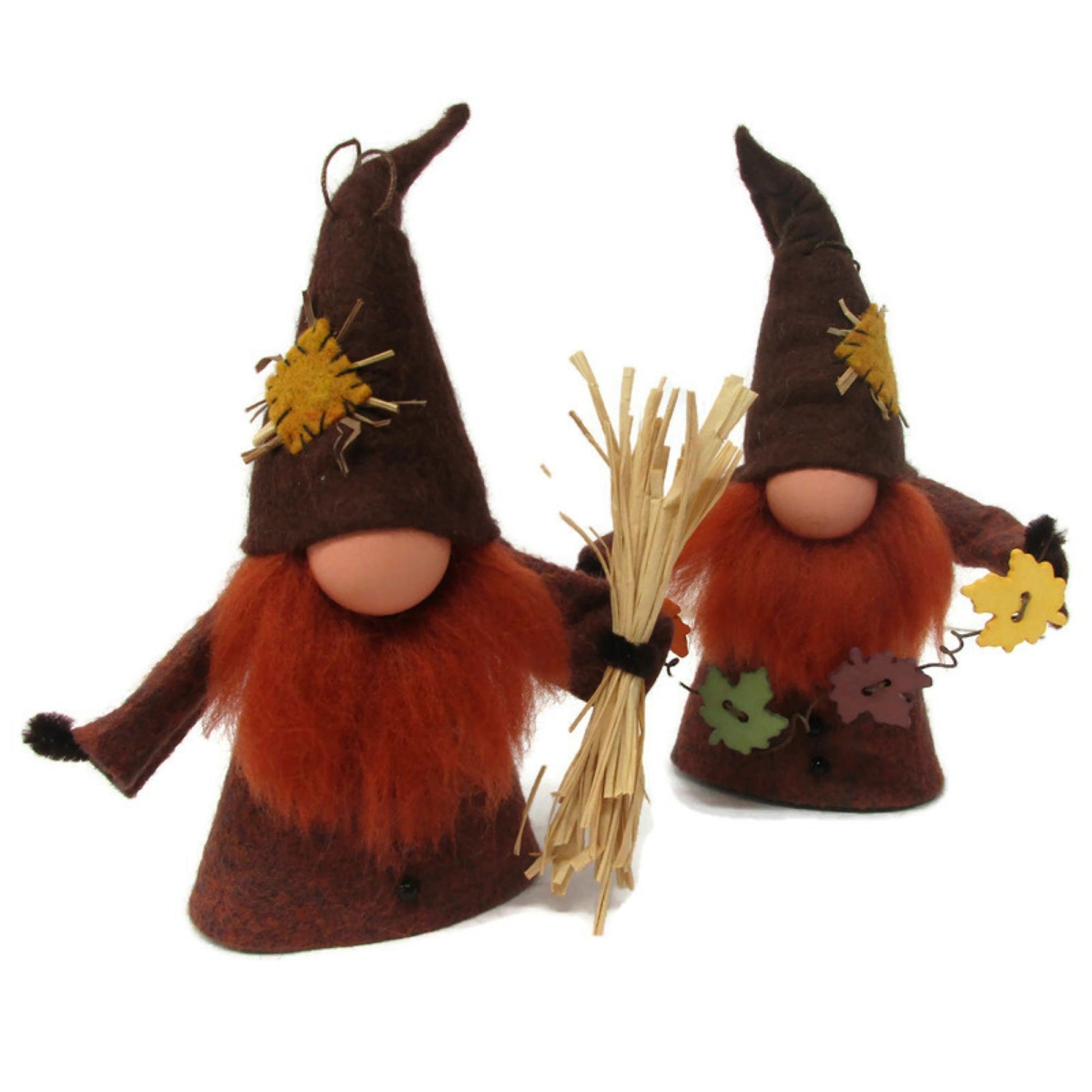 Each ornament comes ready to hang with a loop of embroidery thread through his tall, slightly floppy hat. With their built-in stand they can also freely sit on any shelf, tiered tray or table.