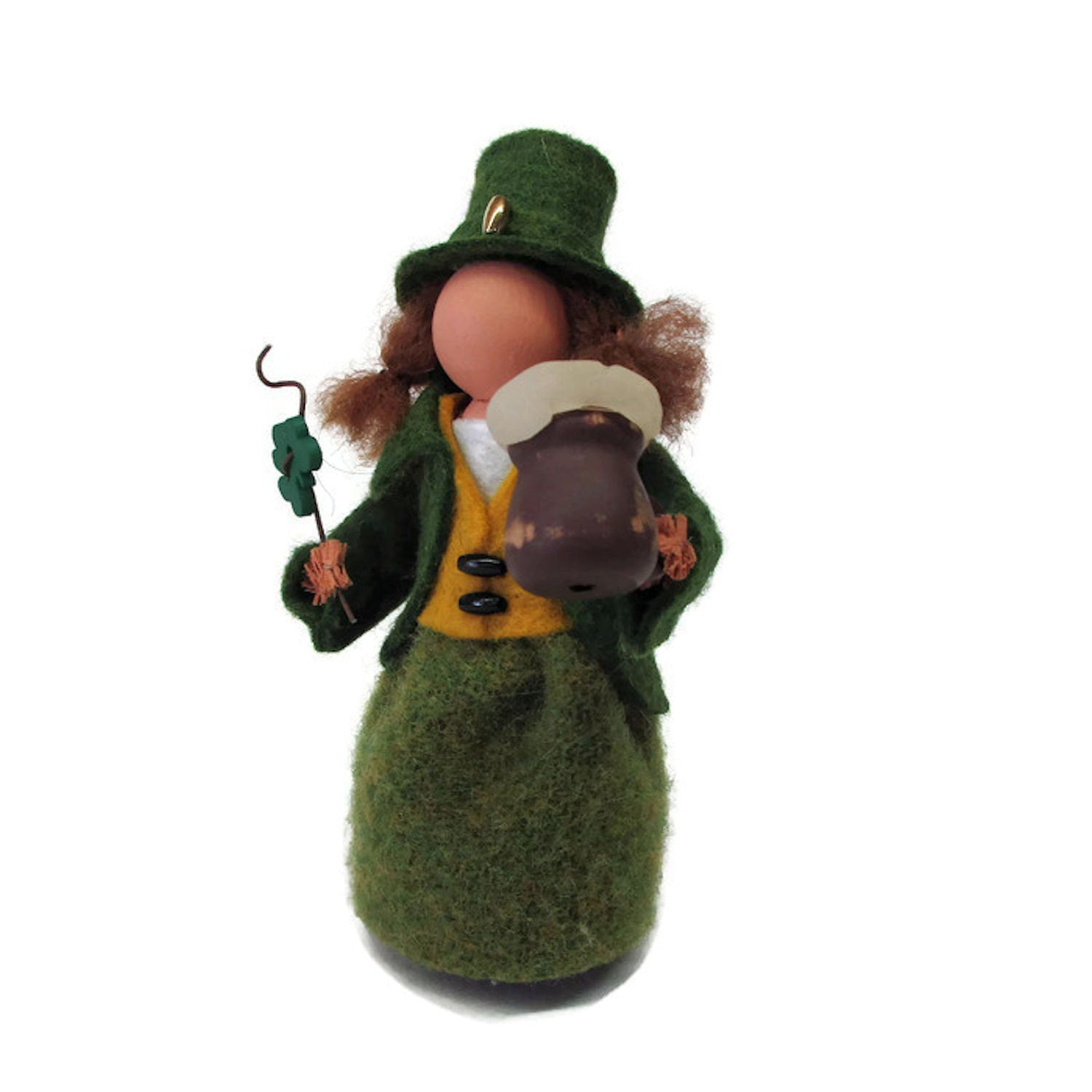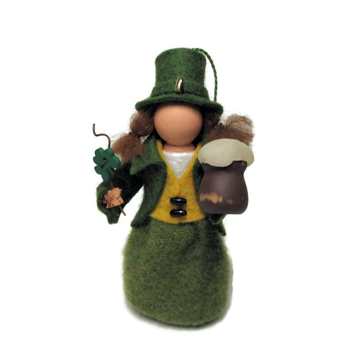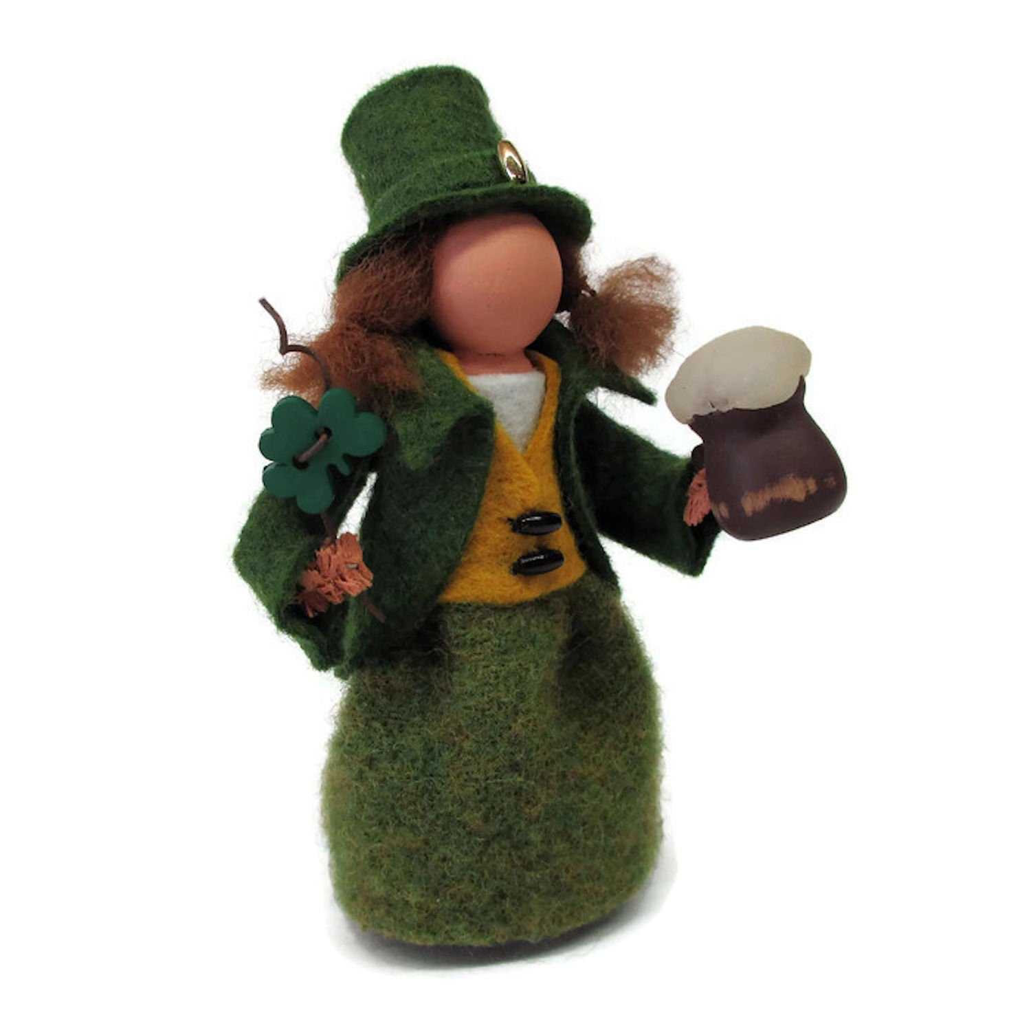 This little clothespin ornament leprechaun lady is ready to celebrate with her Irish pint of ale.
