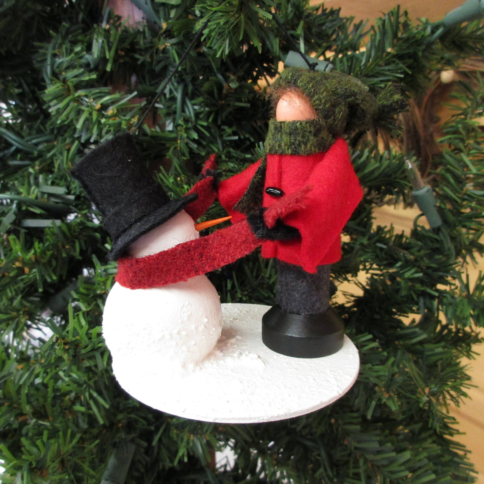Made from craft wood, clothespin body, spun cotton, wool plaid and wool felt. NOTE: The exact color and pattern of scarf and hat combination will vary. The little scene is ready to hang on your holiday tree with a loop at the top. Or just set on any table, shelf, tiered tray or even in a winter village scene.