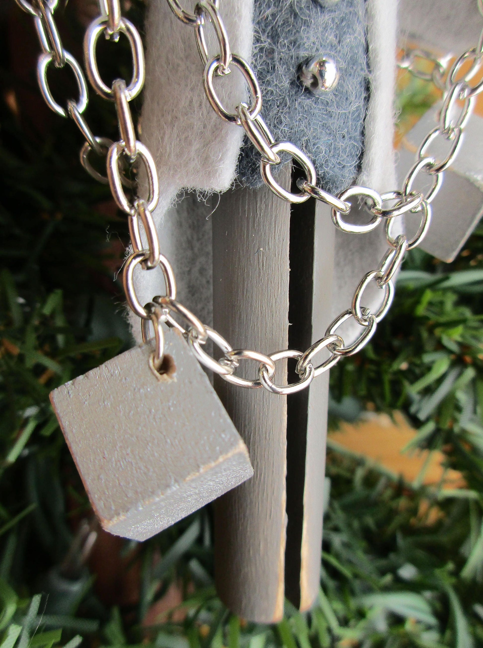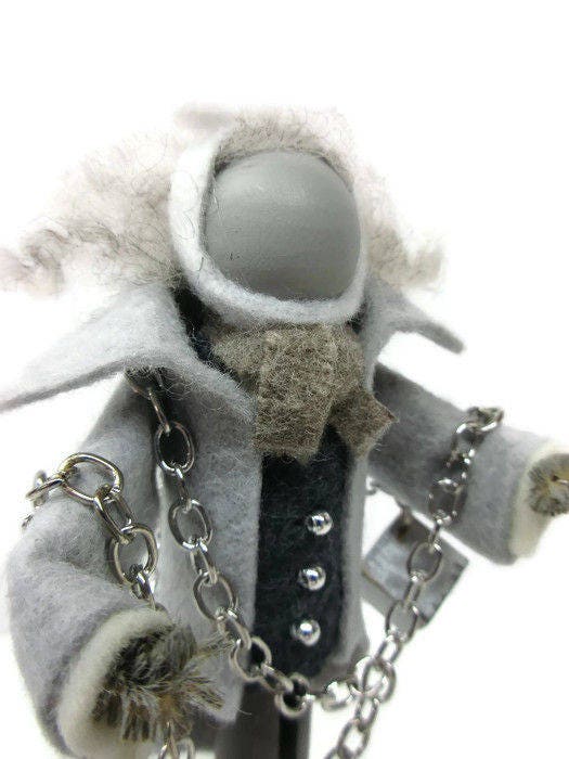 Made from craft wood, clothespin body, wool felt, animal fiber and silver chains. He is ready to hang on your holiday tree or stand him upright on any table, shelf or tiered tray with the included doll stand.