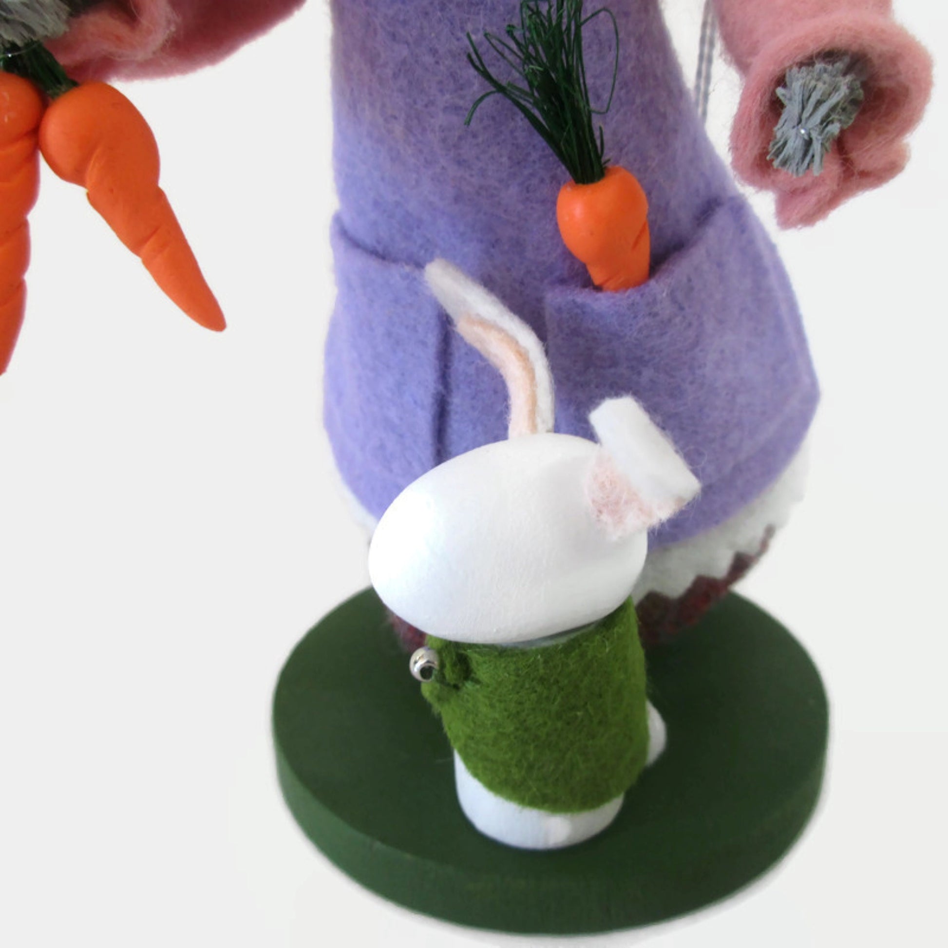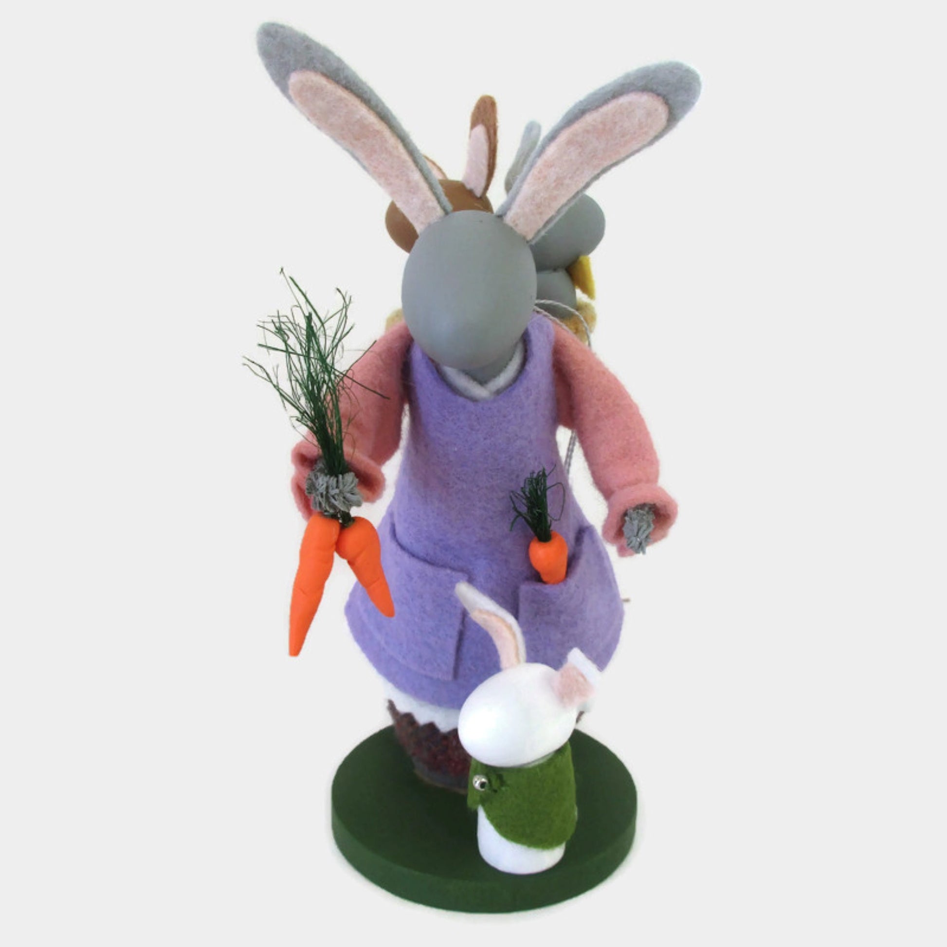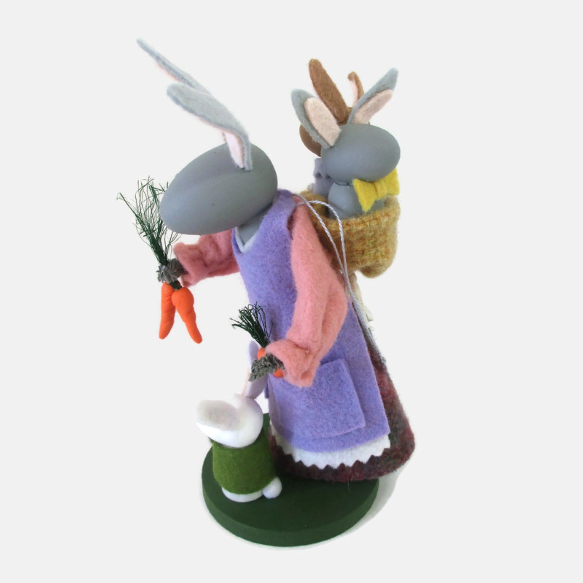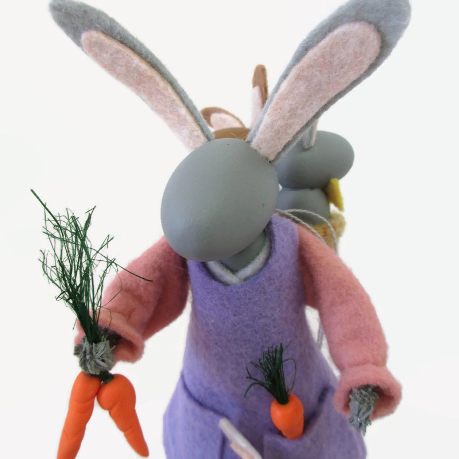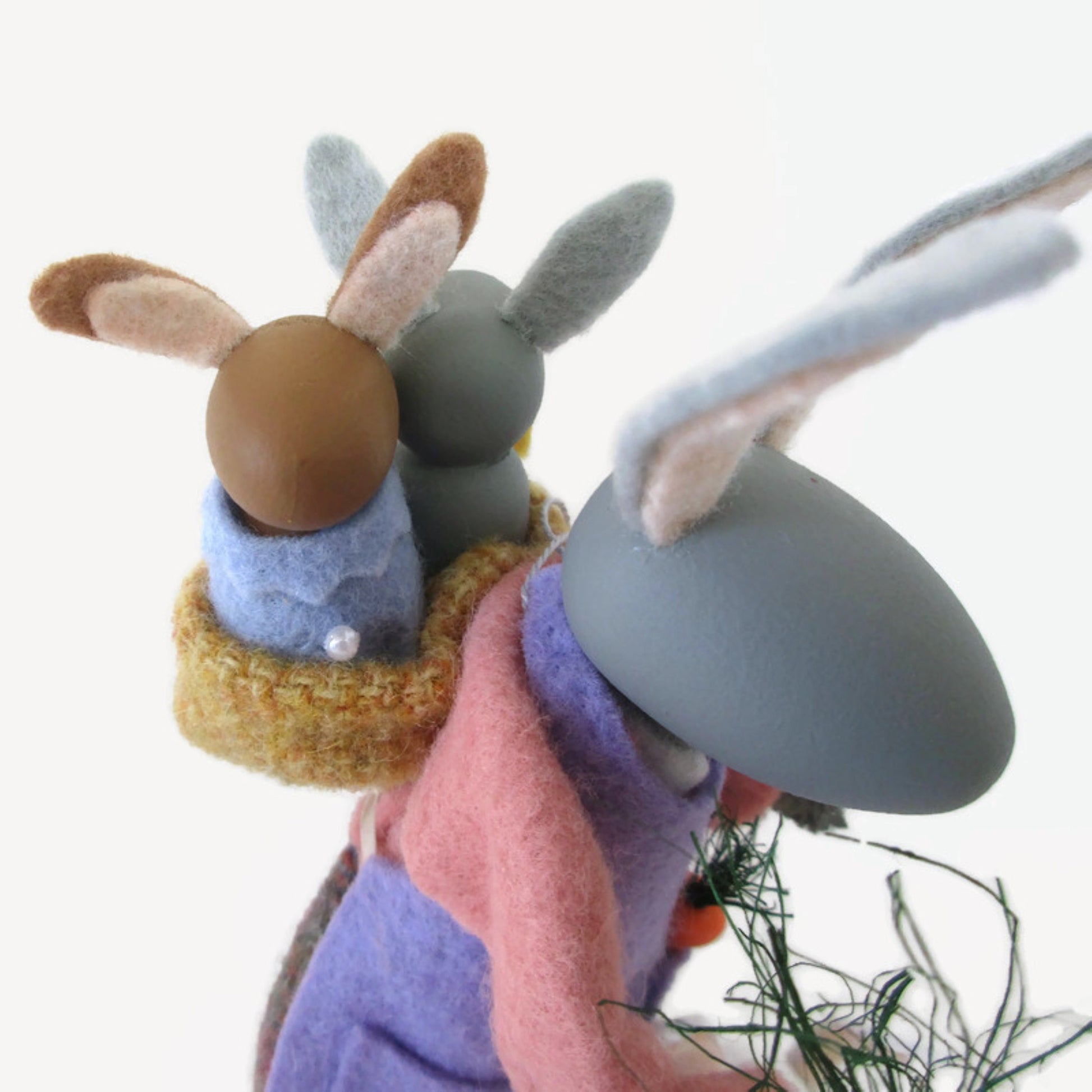 Made from craft wood, clothespin body, and wool felt. NOTE: Clothing and accessories worn by the baby bunnies may vary and be in random colors. The little scene is ready to hang on your holiday tree with a loop through the top of Momma's shoulder. Or just sit them flat on any table, shelf or tiered tray.