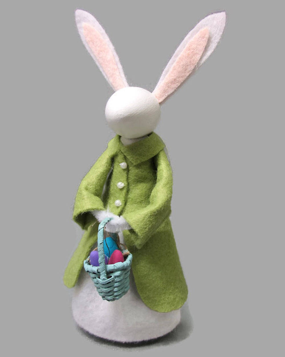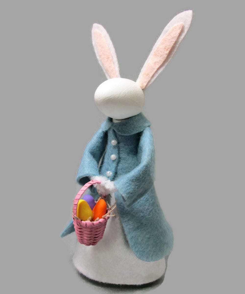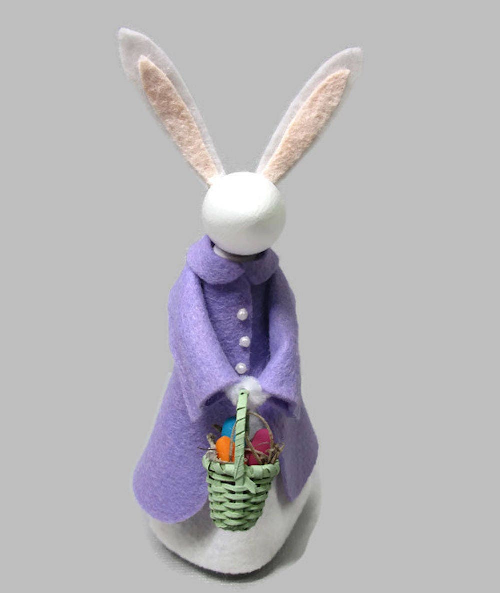 In celebration of the Easter holiday is a clothespin ornament lady bunny with a basket of eggs. She is available in multiple jacket colors.