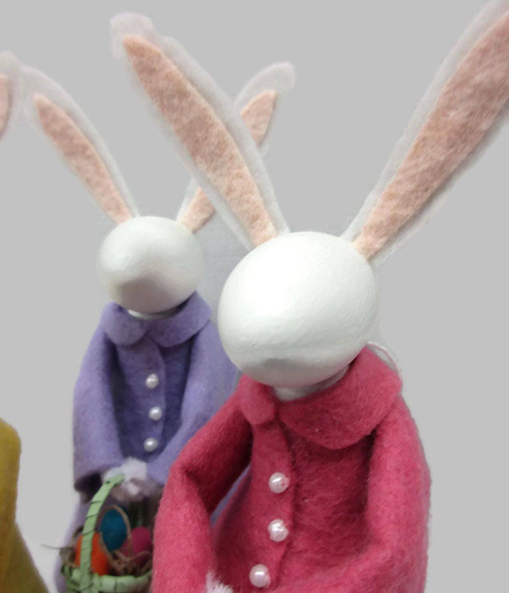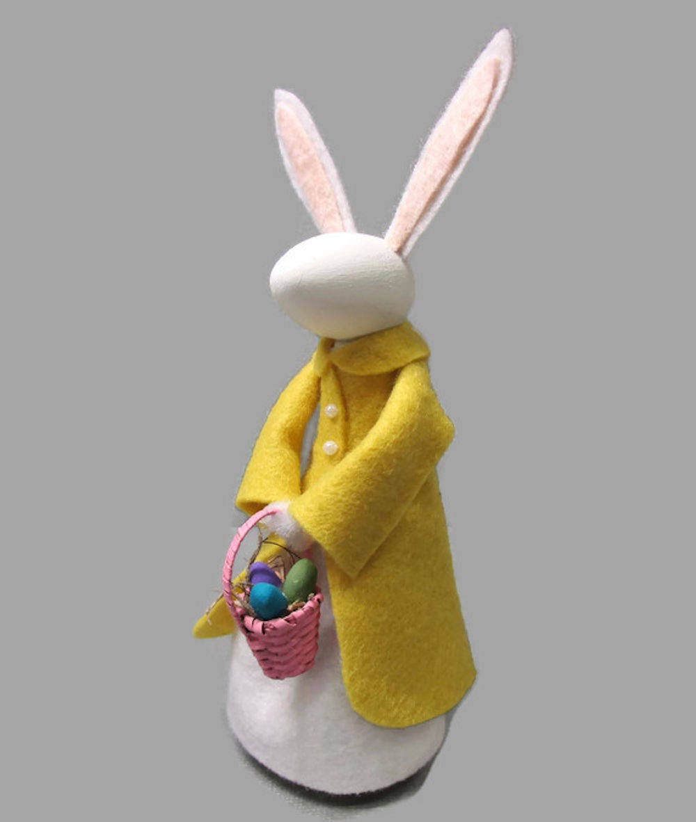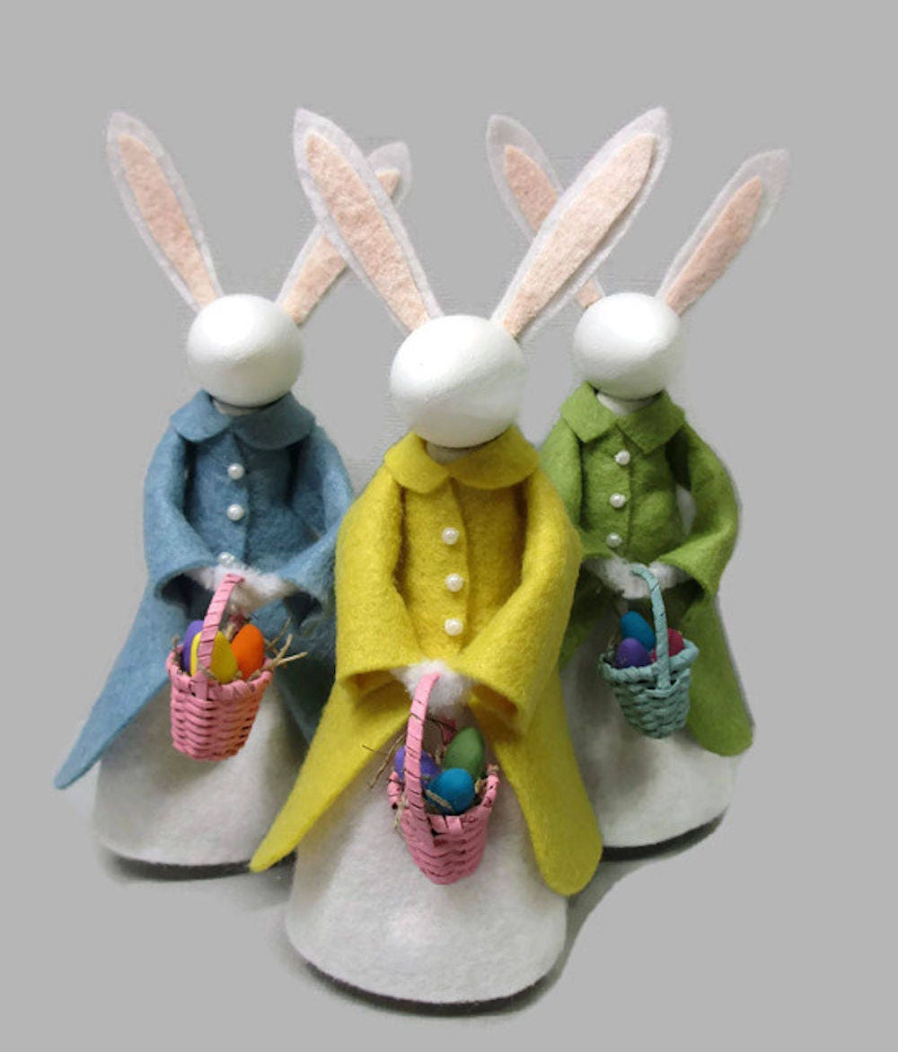 Made from craft wood, clothespin body, polymer clay and wool felt. NOTE: Exact color of Easter eggs and basket will vary - though each will be either pastel or bright spring colors. She is ready to hang on your holiday tree with a loop through the top of her back. Or use the included doll stand to display her on any table, shelf or tiered tray.