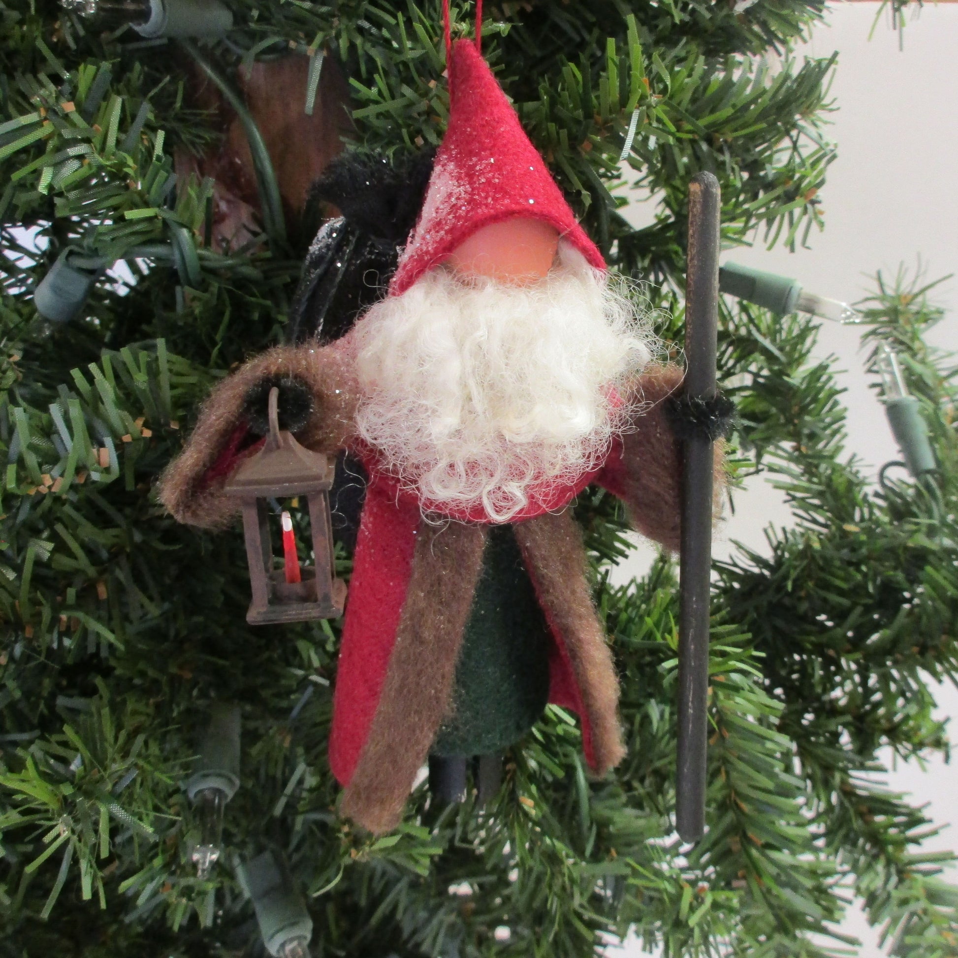 Clothespin ornament of an old world, vintage European style Santa carrying his pack.