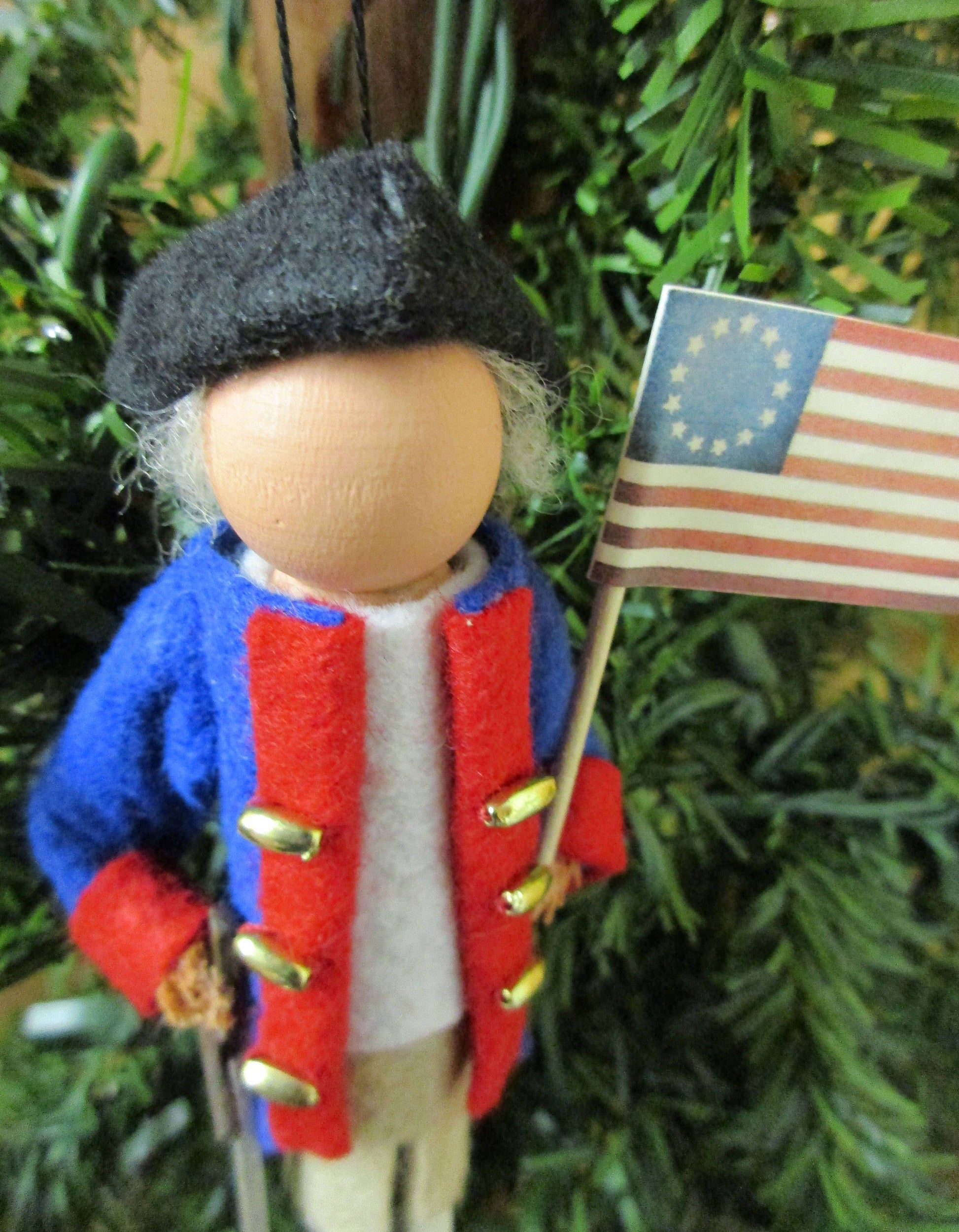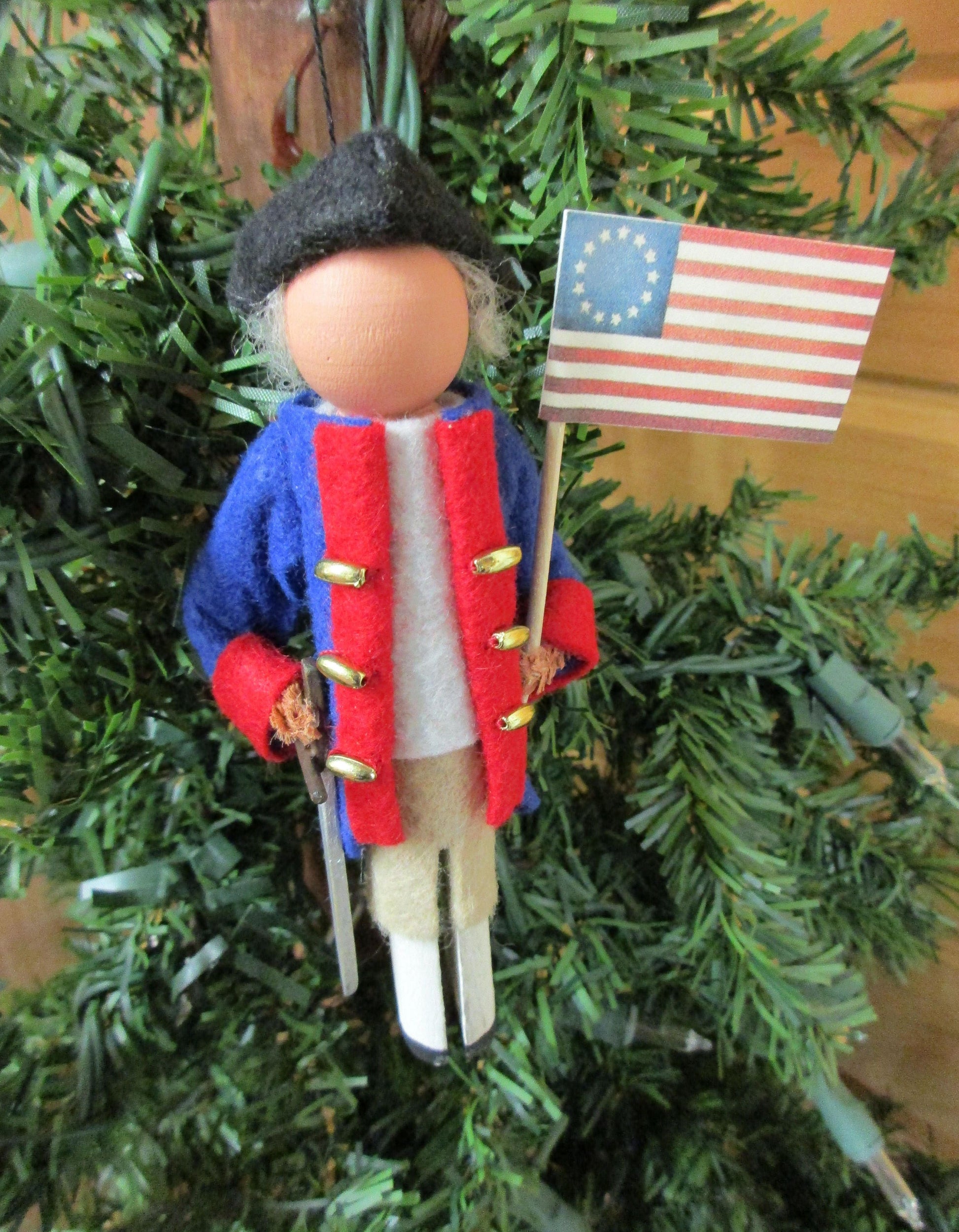 Clothespin ornament of a colonial soldier, ideal for any history buff.