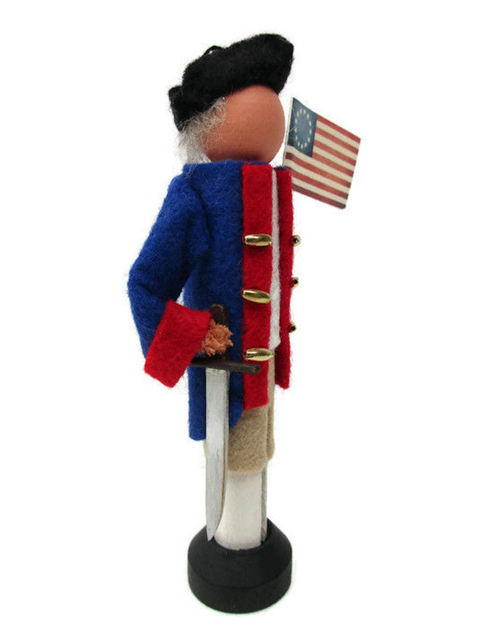 Made from craft wood, clothespin and wool felt, he is ready to hang on your holiday tree with a loop atop his tricorn hat. Or use the included doll stand to display him on any table, shelf or tiered tray.