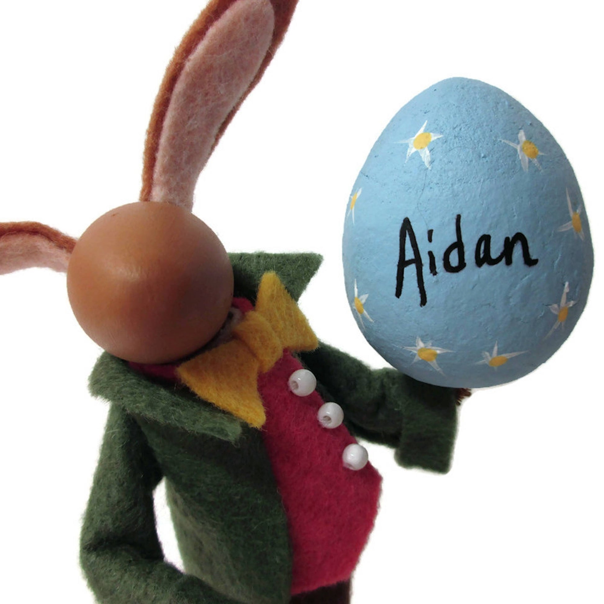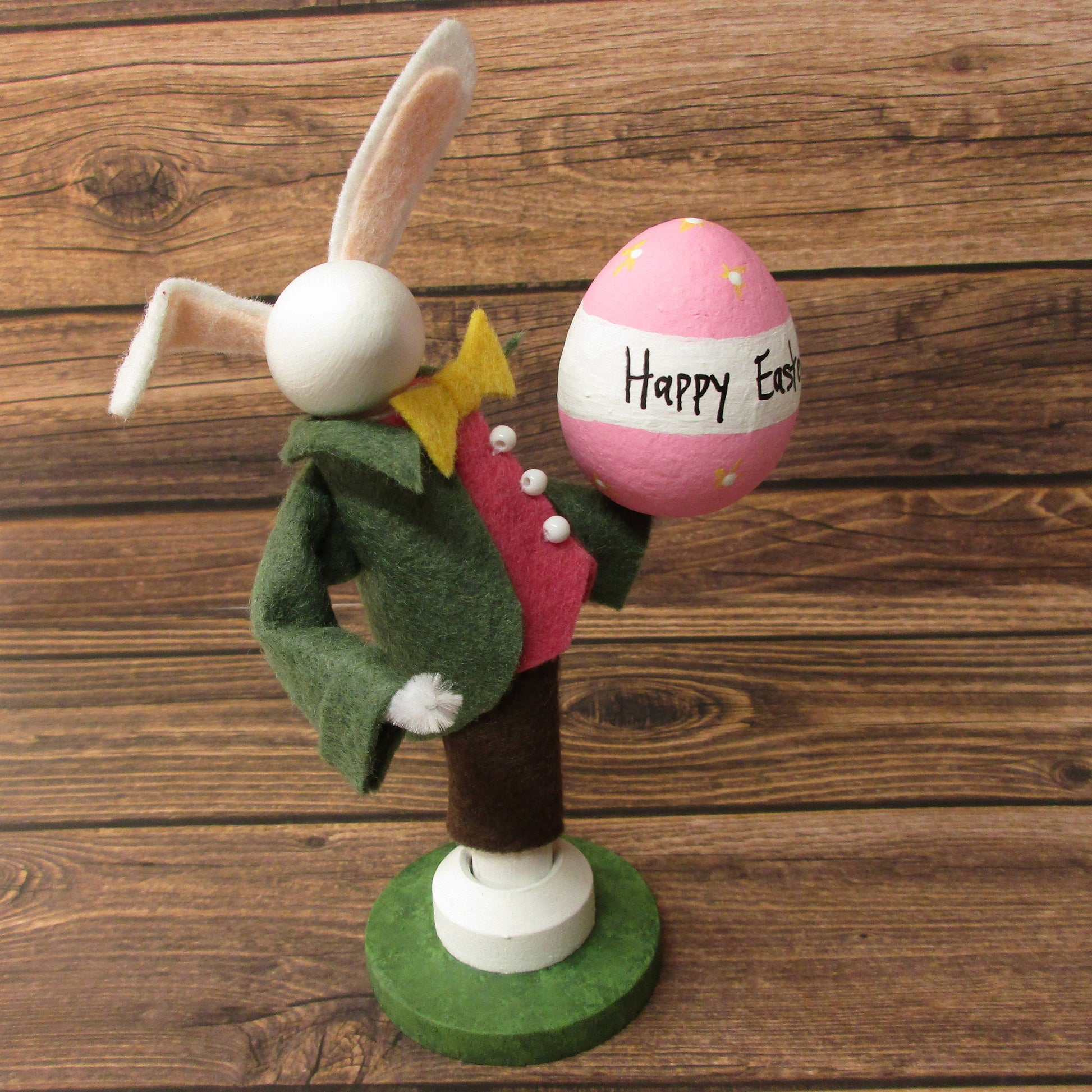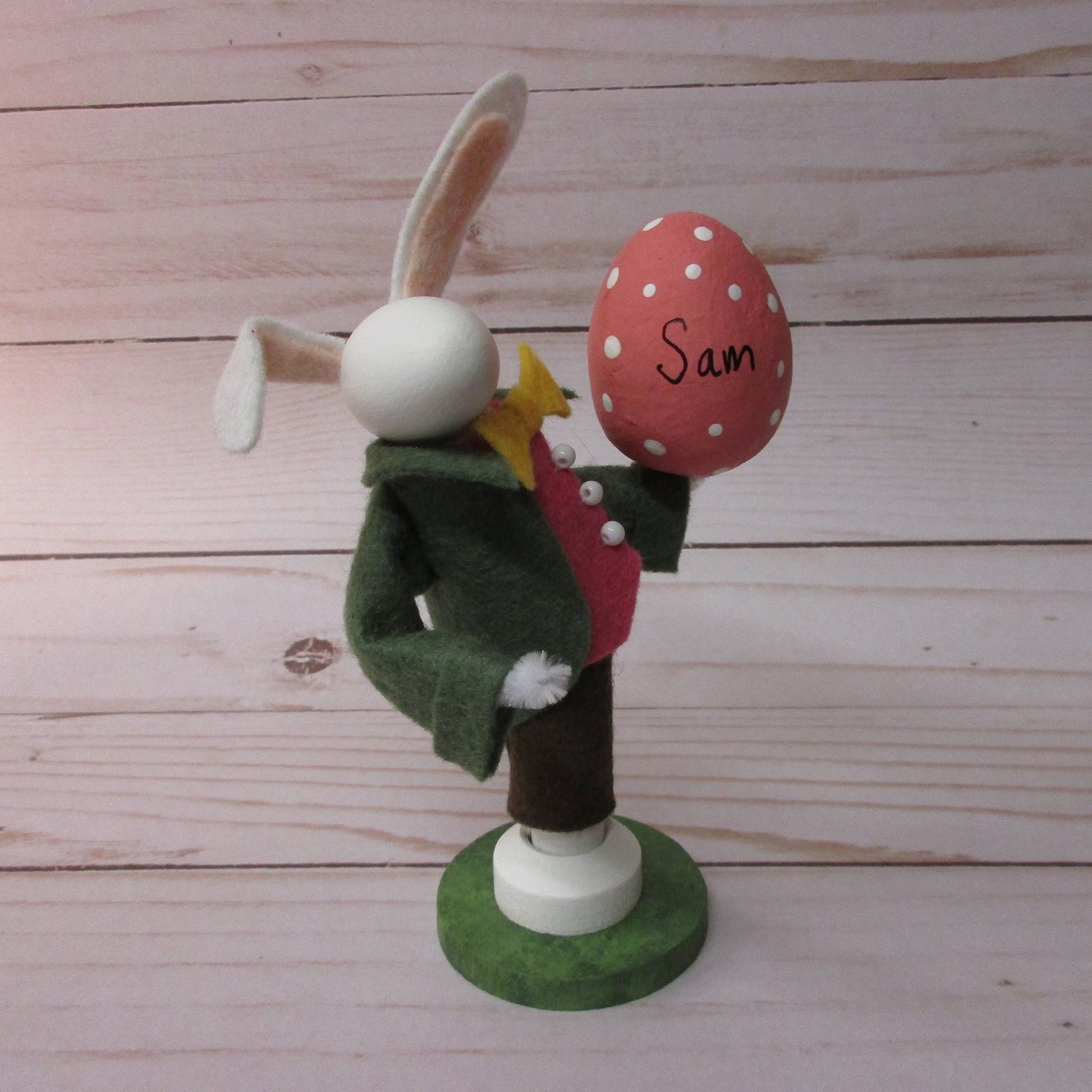 Make this clothespin Easter Bunny your own with a personalized message on the Easter egg. Due to the weight distribution and size of this fellow, he does not hang on the tree but is a table-top ornament only.