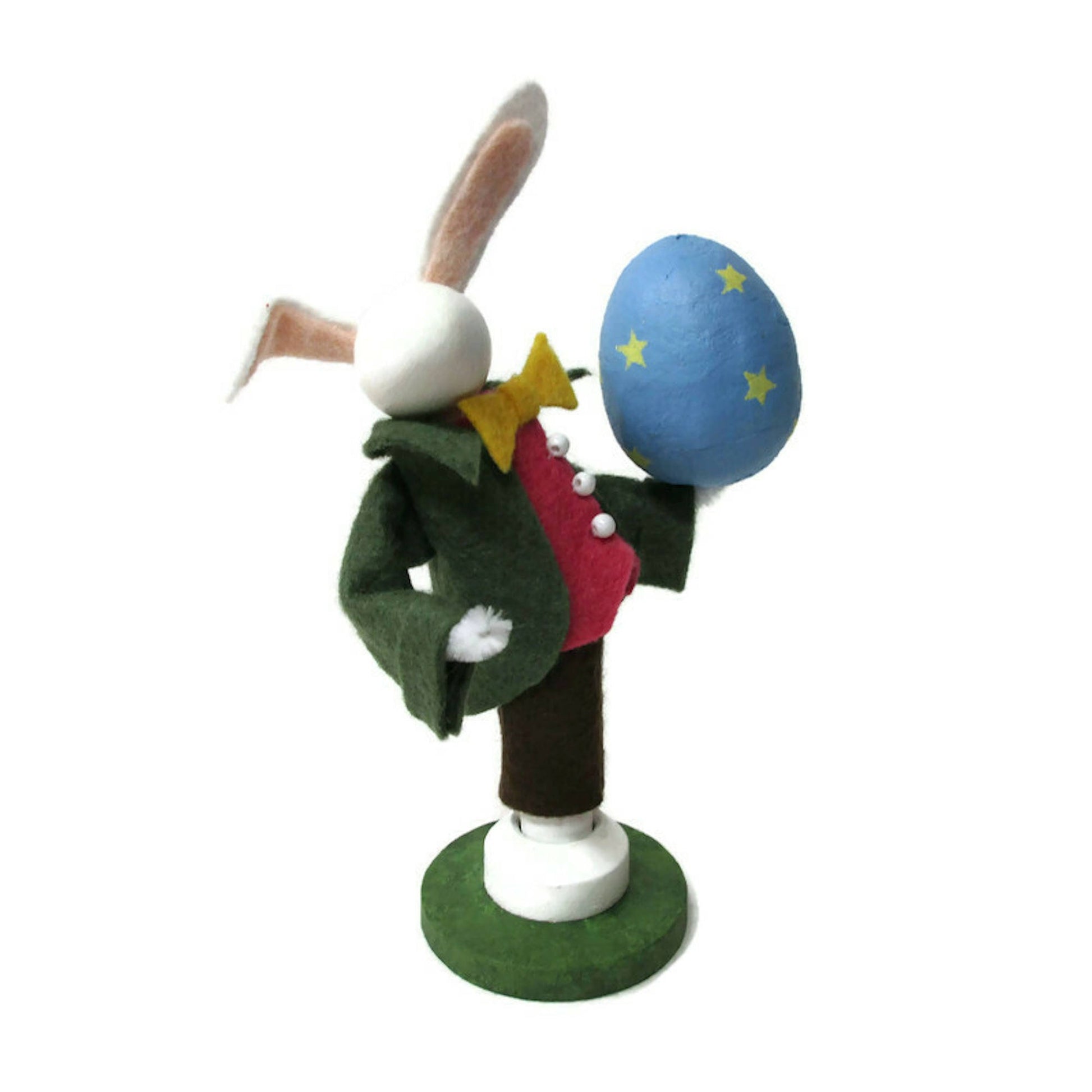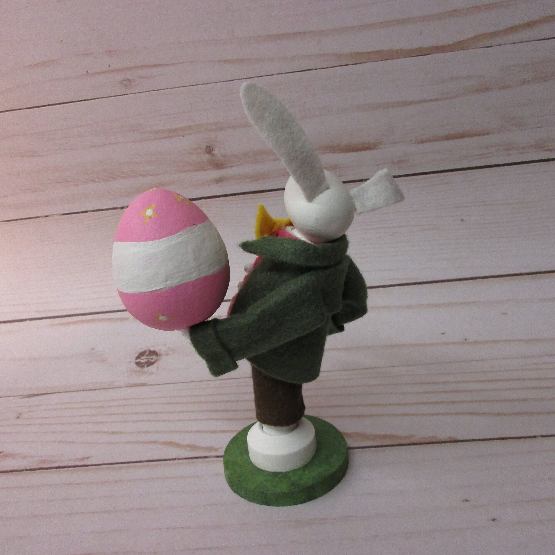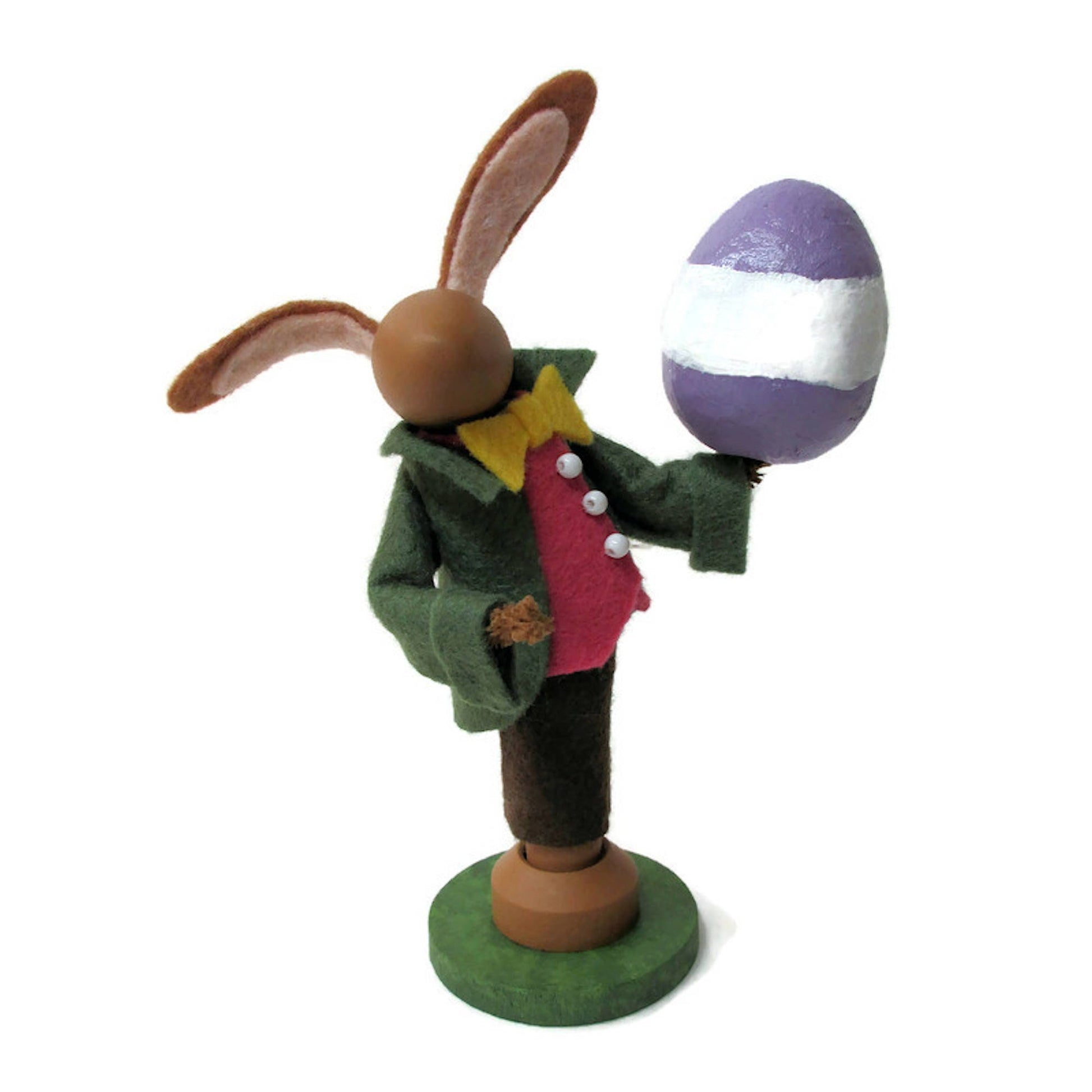 Make this clothespin Easter Bunny your own with a personalized message on the Easter egg. Due to the weight distribution and size of this fellow, he does not hang on the tree but is a table-top ornament only.