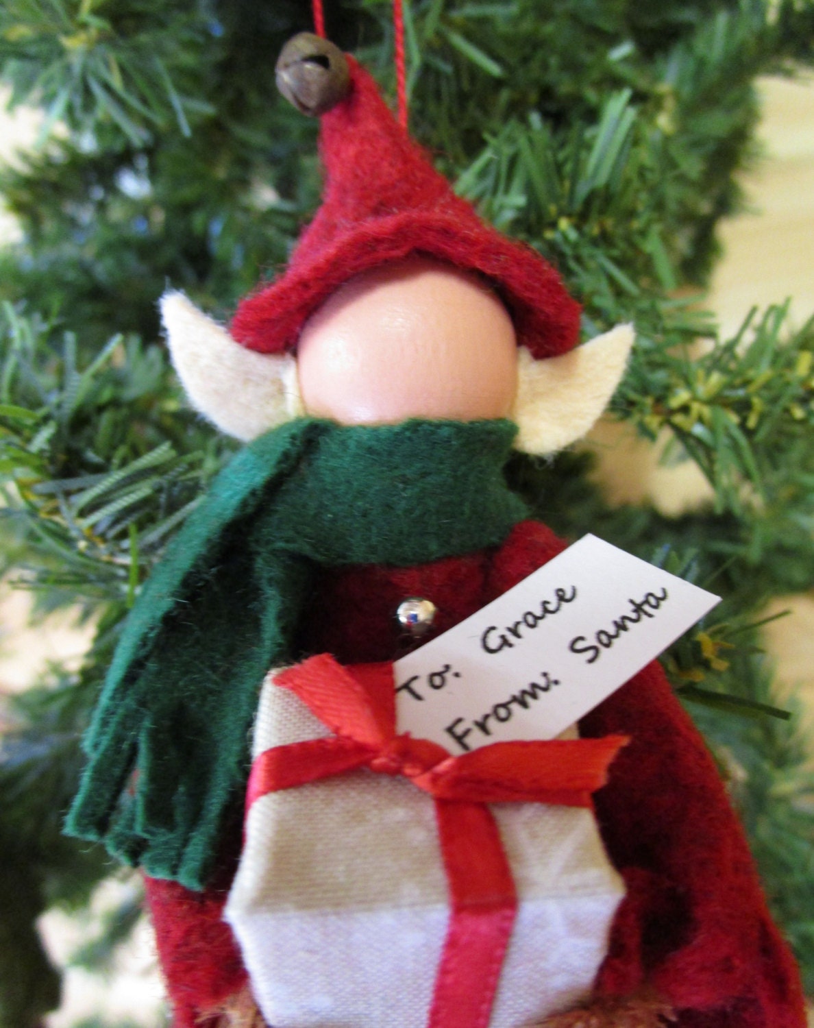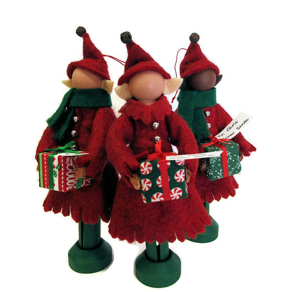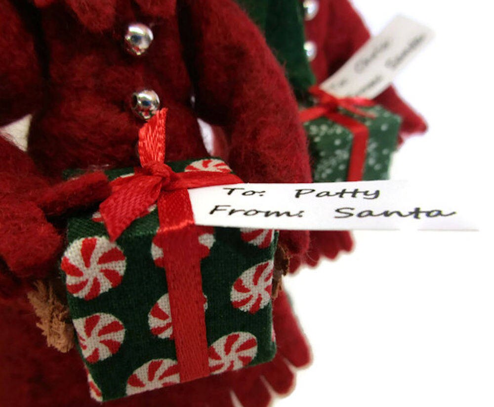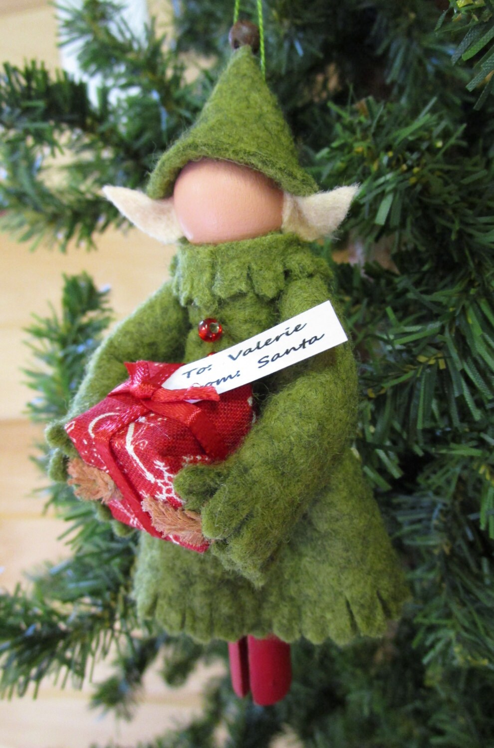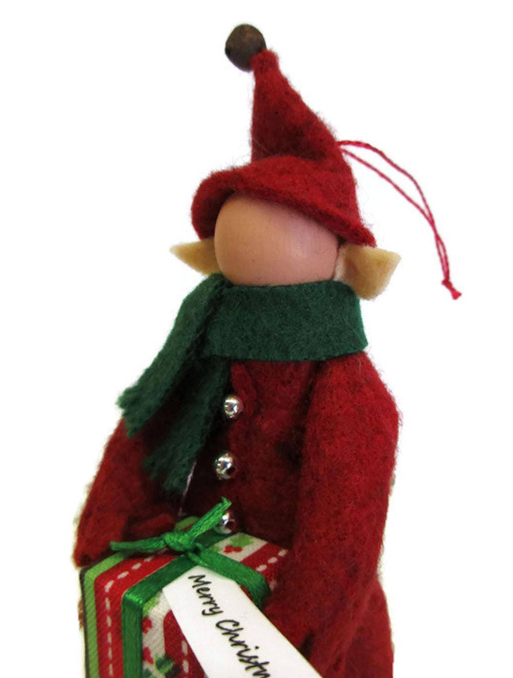 This clothespin ornament elf girl carries a special package with a gift tag that can be personalized or just choose a generic "From Santa" or "Merry Christmas" tag instead.