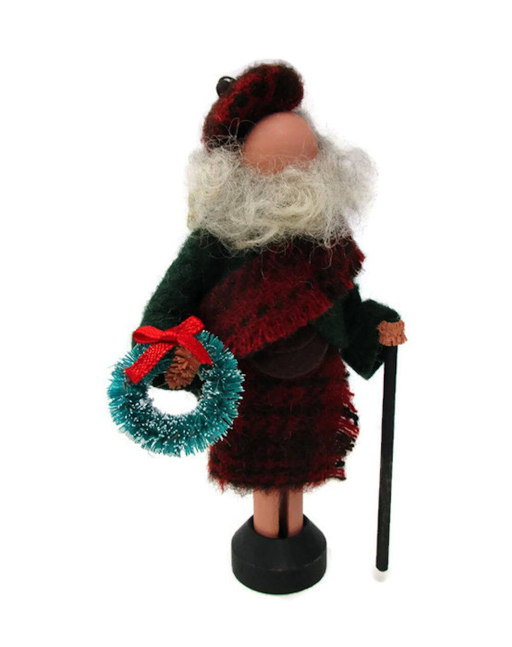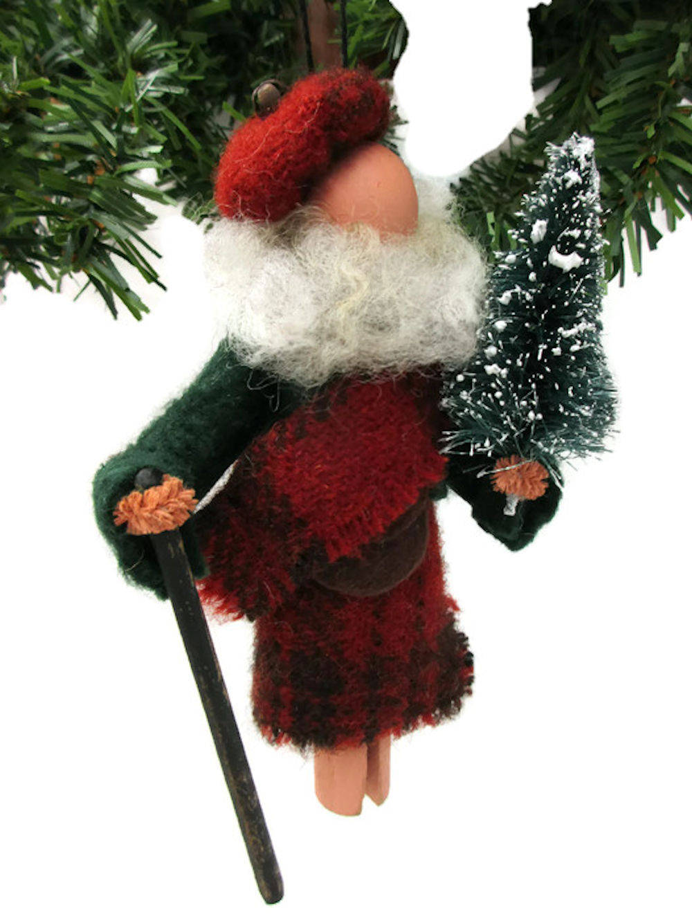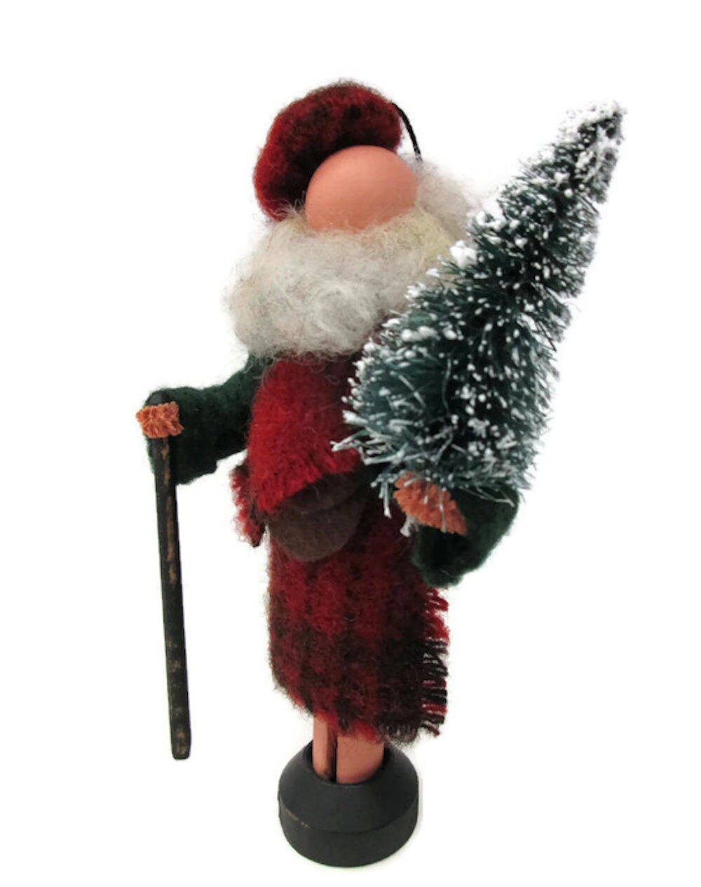 Made from craft wood, clothespin body, animal fiber, wool plaid and wool felt. He is ready to hang on your holiday tree with a loop through the top of his hat. Or use the included doll stand to display him on any table, shelf or tiered tray.