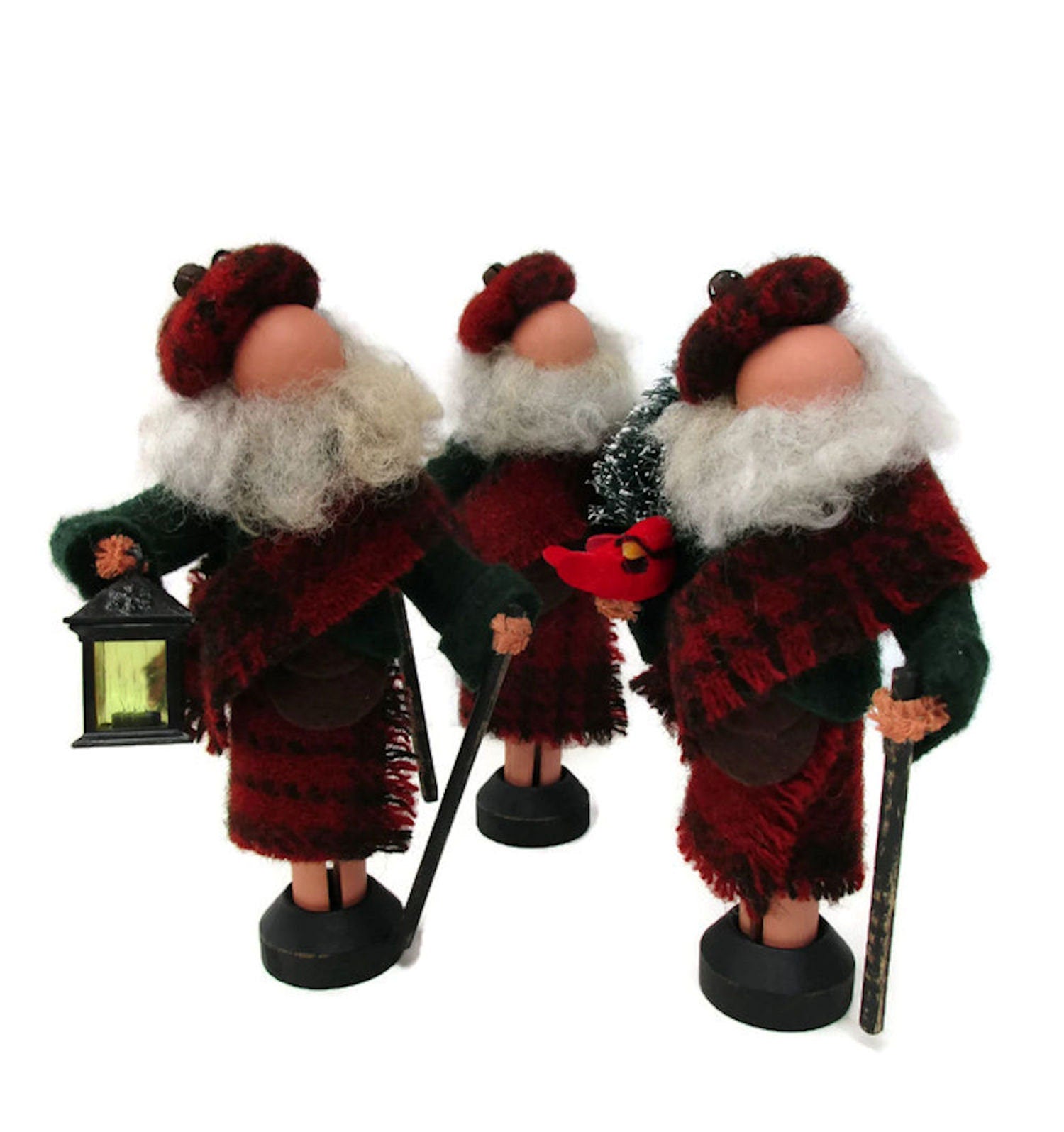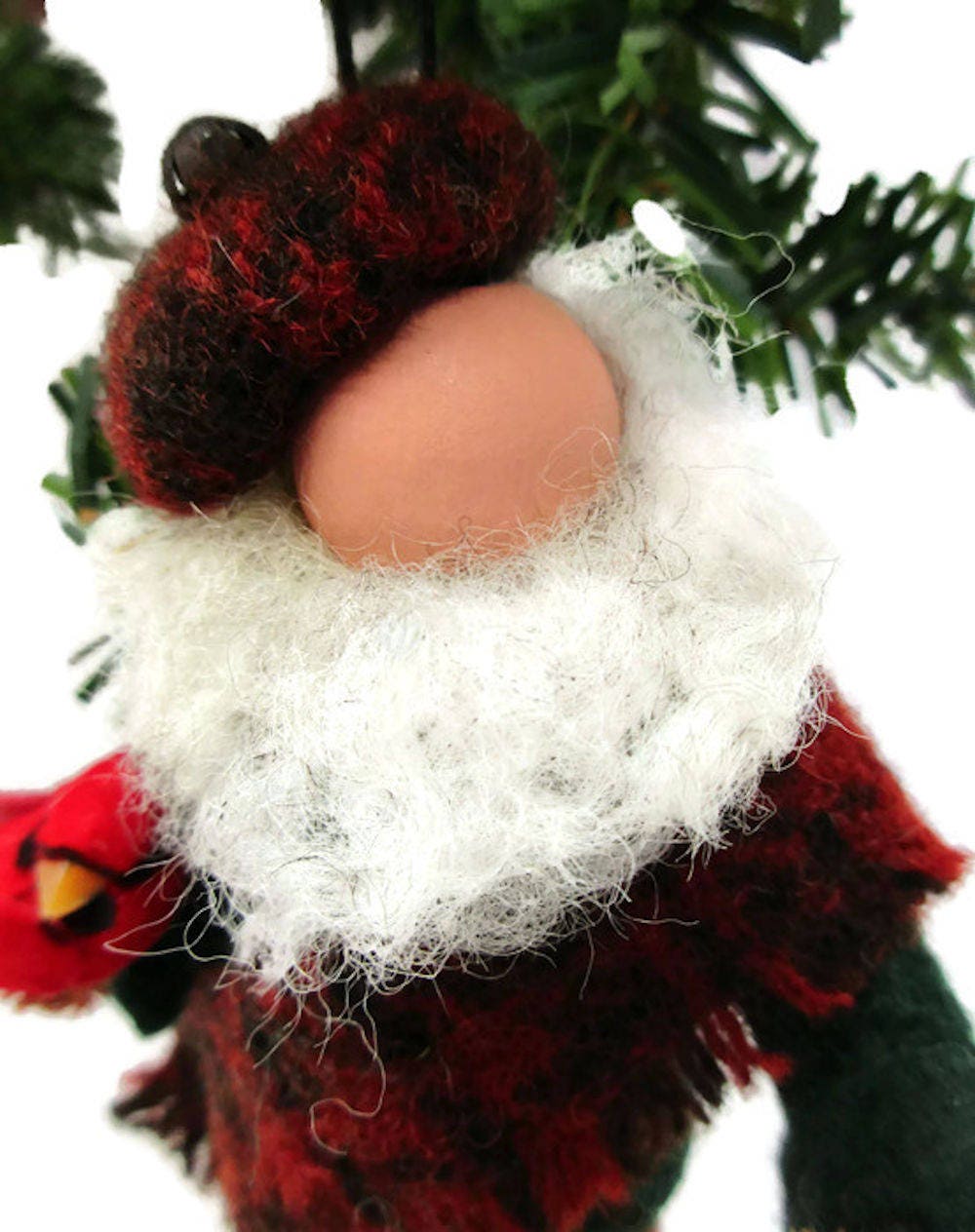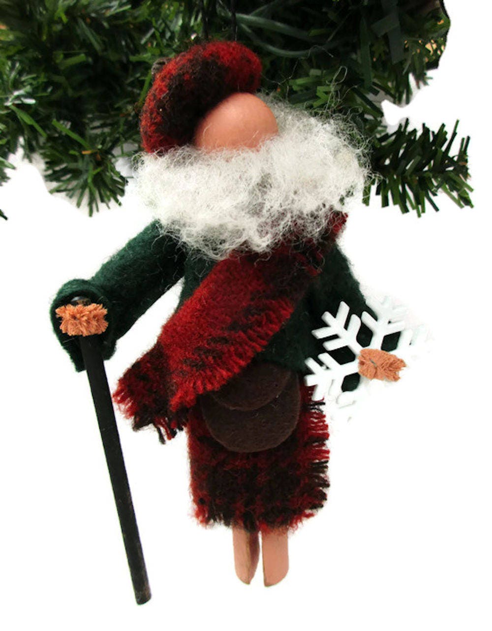 Made from craft wood, clothespin body, animal fiber, wool plaid and wool felt. He is ready to hang on your holiday tree with a loop through the top of his hat. Or use the included doll stand to display him on any table, shelf or tiered tray.