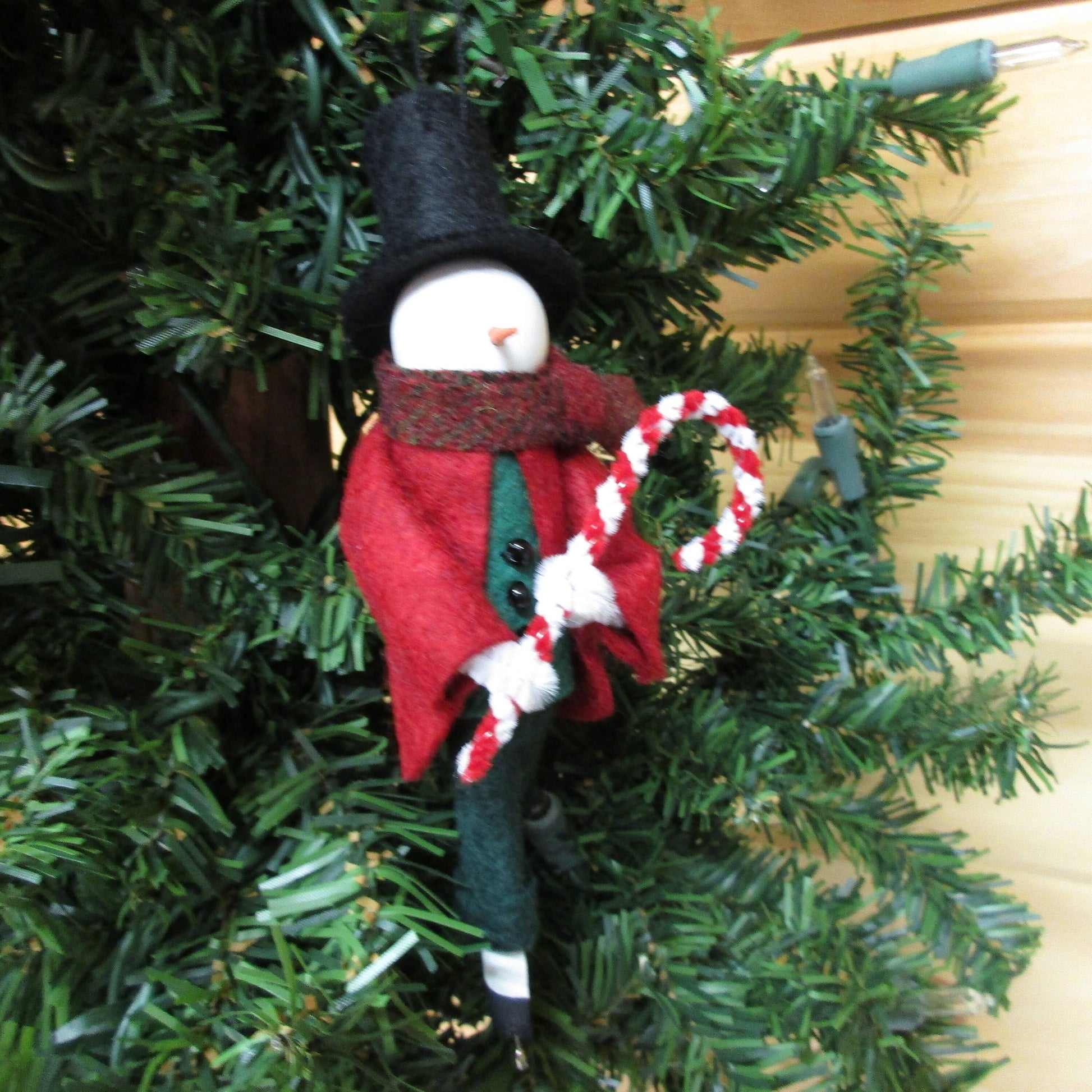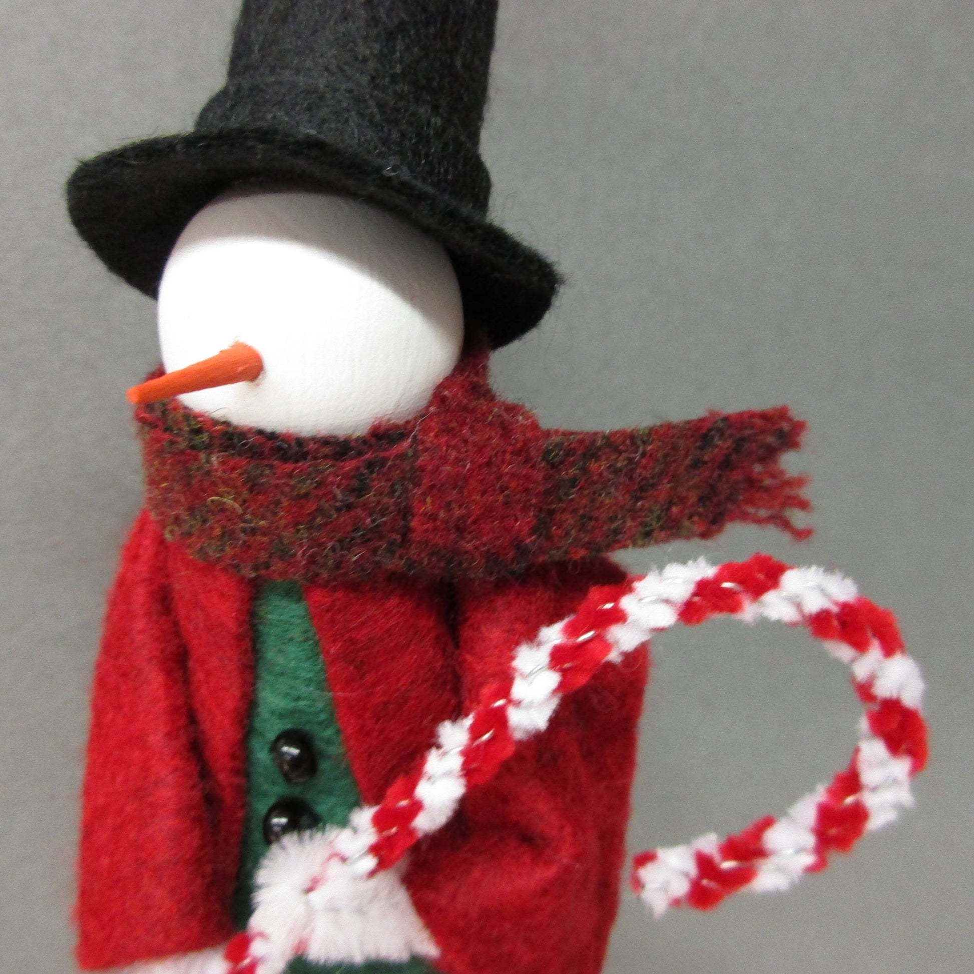 He is ready to hang on your holiday tree with a loop through the top of his hat.